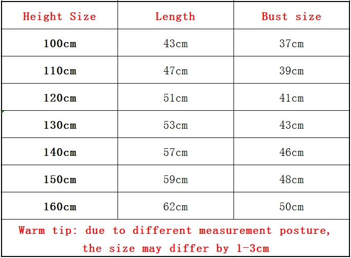 140cm Lengyh 56cm,Bust size 48cm,Trousers length 81cm , the waist 58cm, Suit For Height 130-140cm