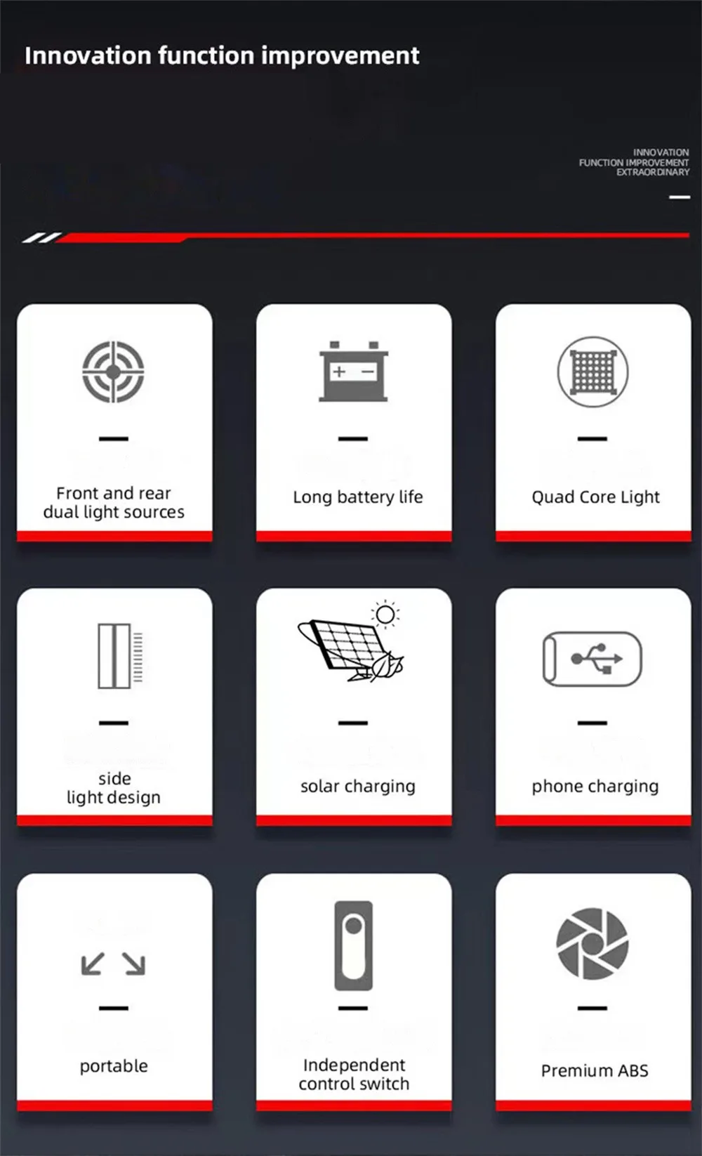 1. Side solar charging, side high-efficiency solar charging board, high charging conversion rate, and can be charged with light.