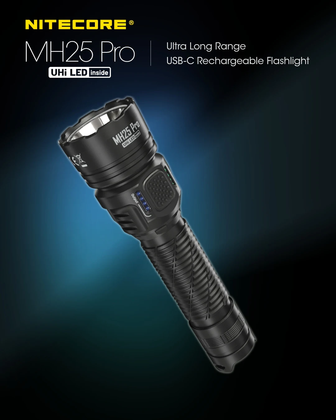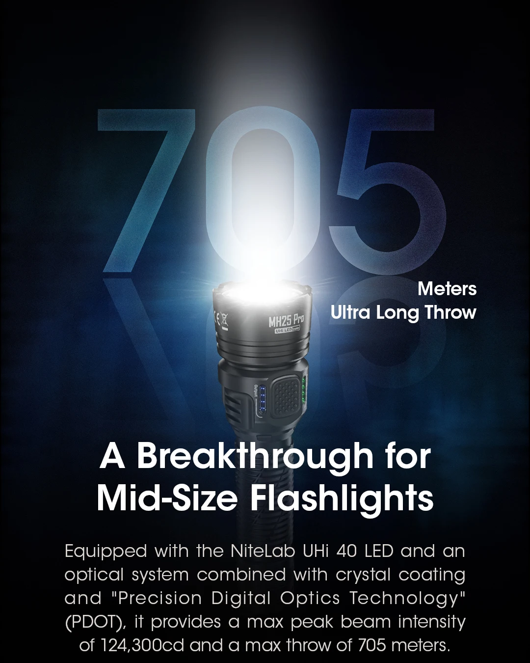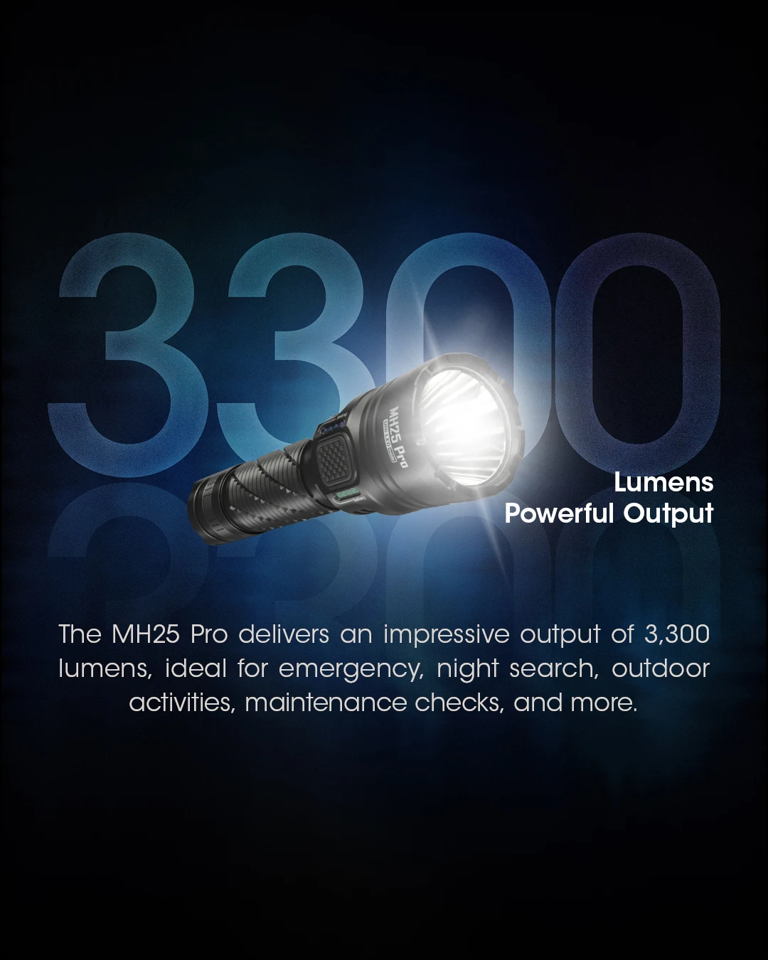 The NTECORE MH25 Pro is an ultra long range flashlight equipped with the NiteLab UHi 40LED. Itcomes standard with a 5,300mAhLi-on battery, offering a max output of 3,300 lumens and a beam distance of 705 meters.