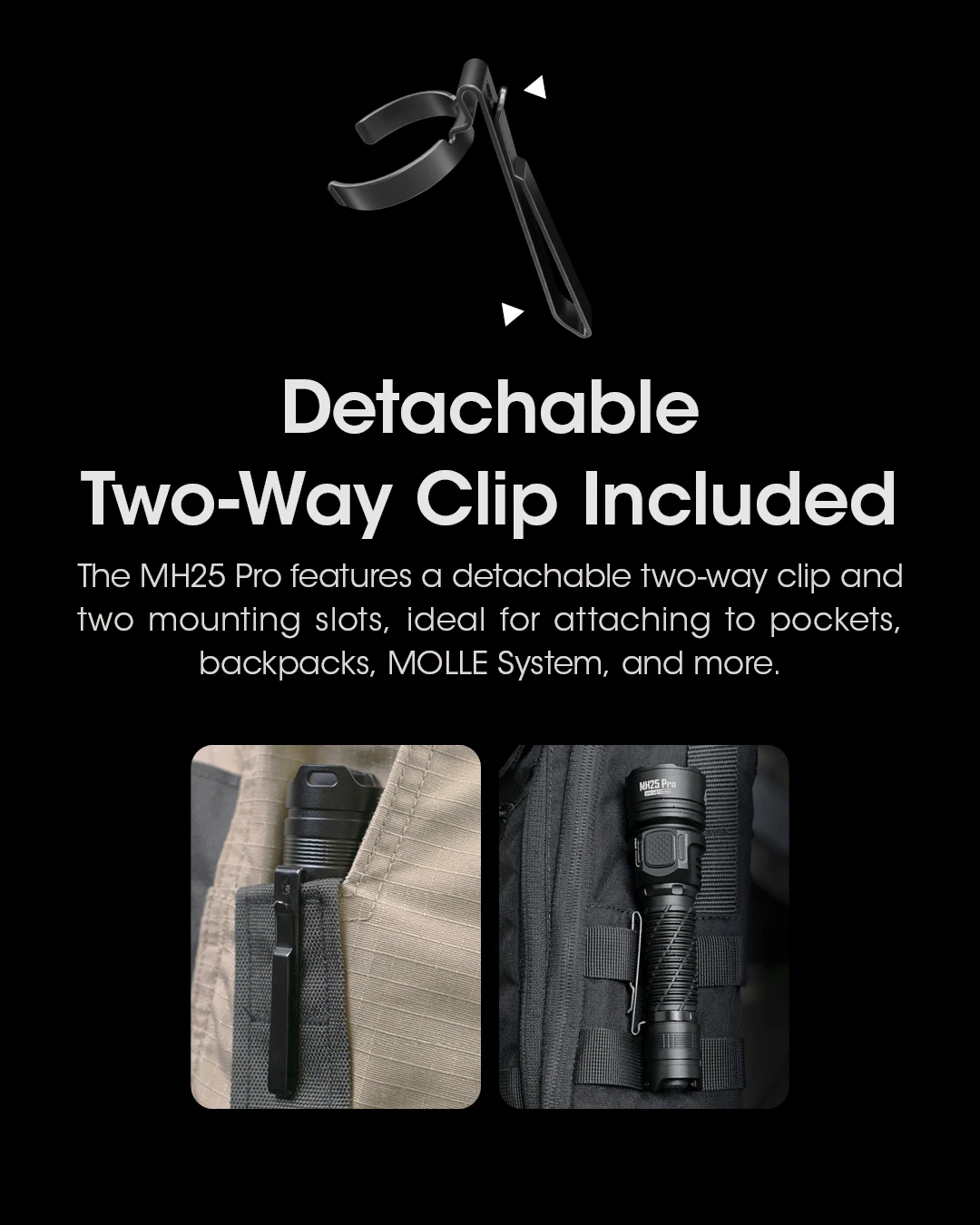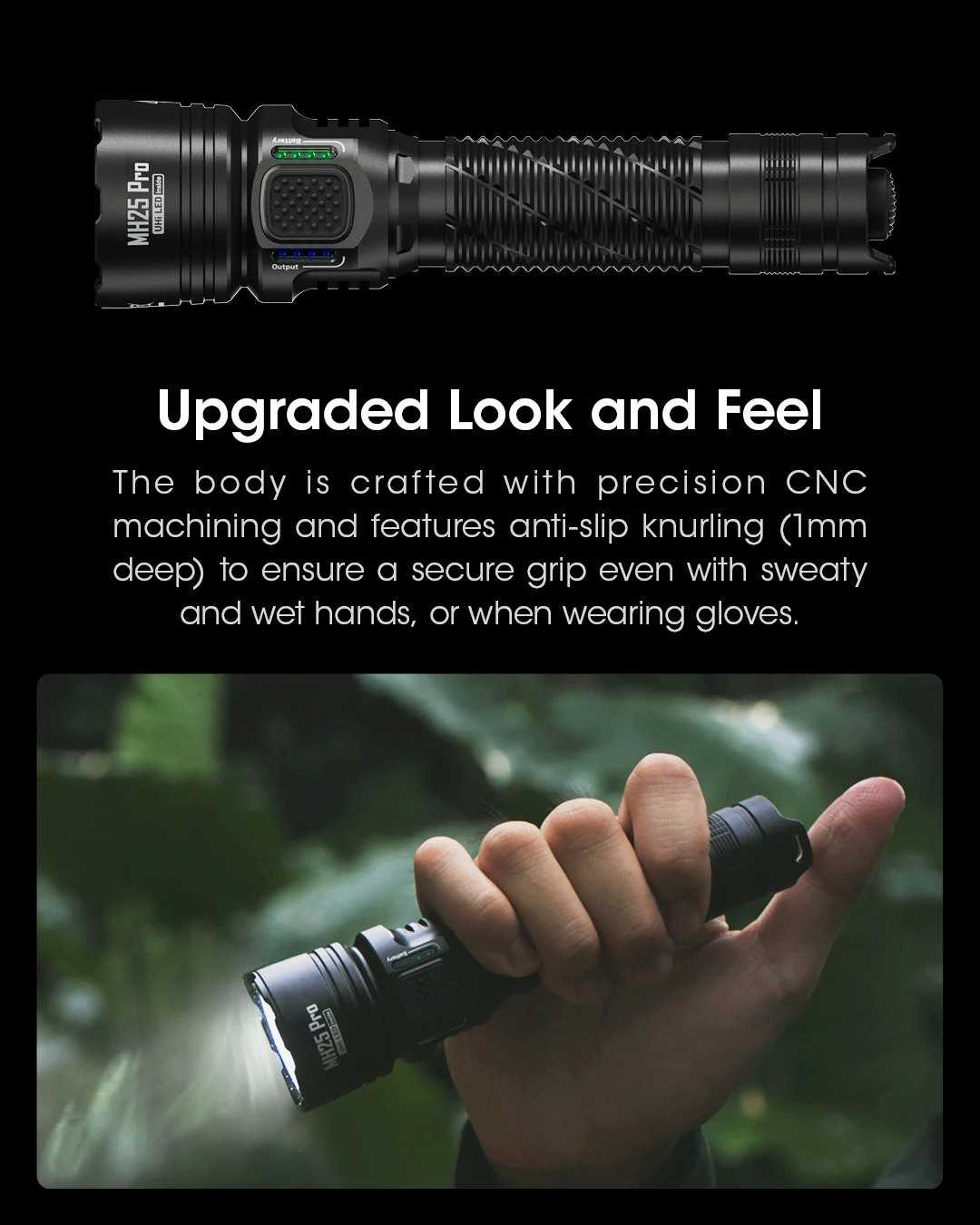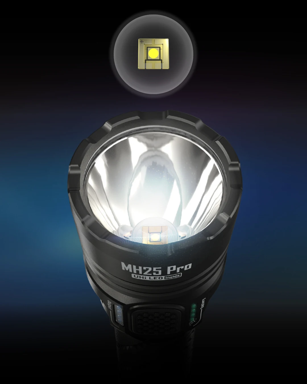 The NTECORE MH25 Pro is an ultra long range flashlight equipped with the NiteLab UHi 40LED. Itcomes standard with a 5,300mAhLi-on battery, offering a max output of 3,300 lumens and a beam distance of 705 meters.