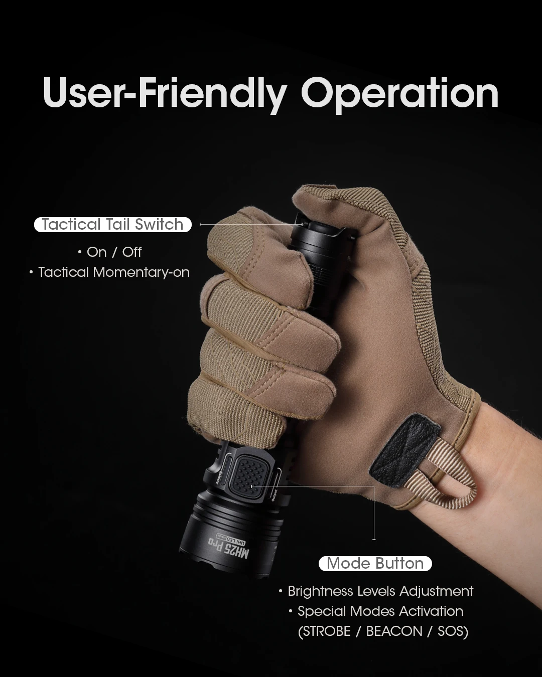 •The tactical tail switch and the mode button control 5 brightness levelsand 3 special modes
