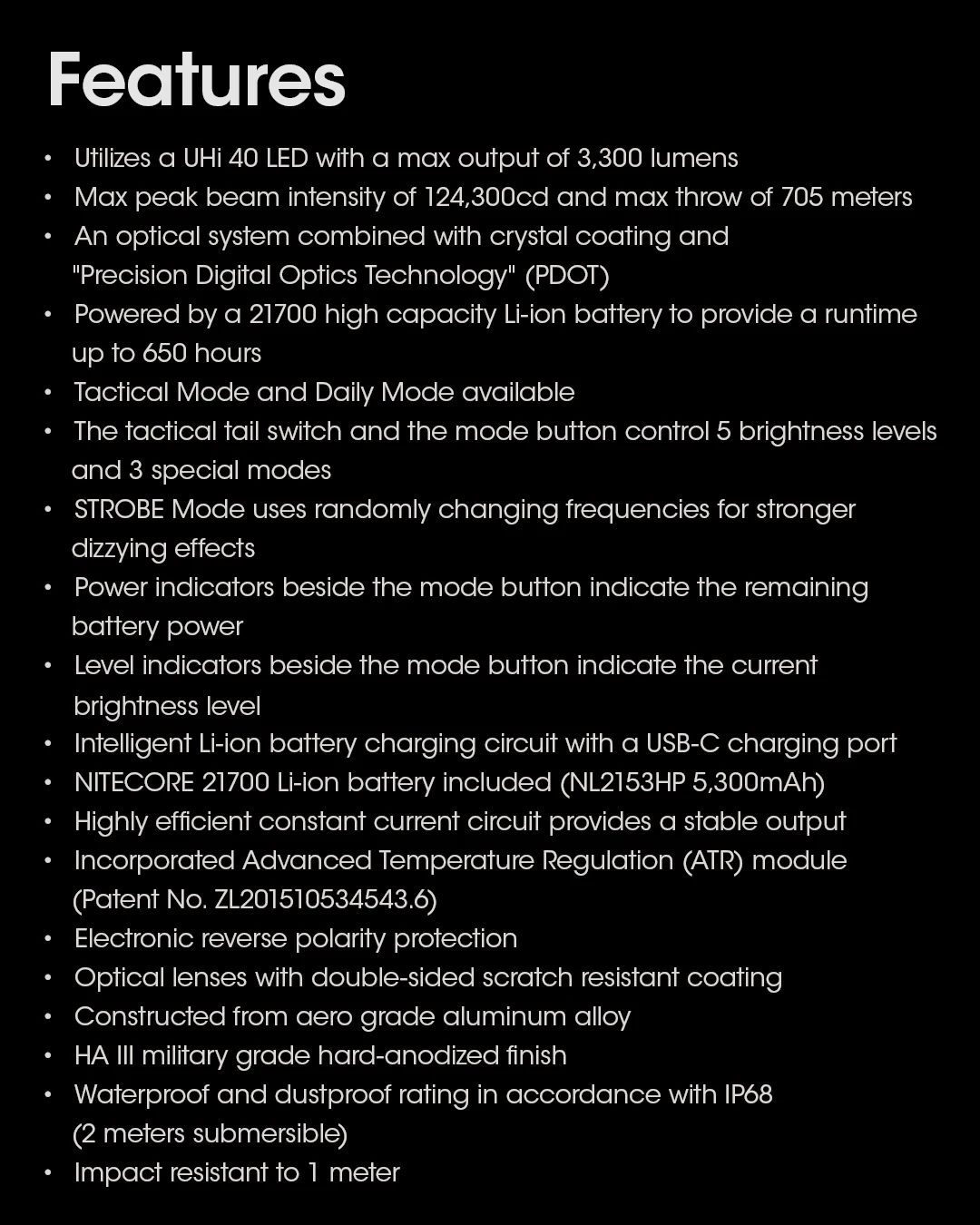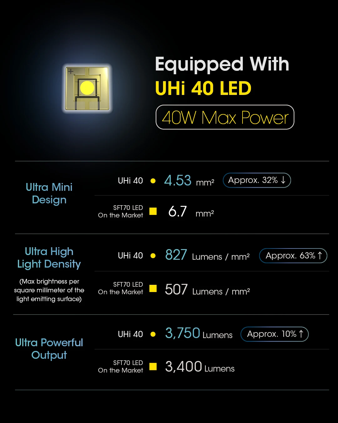 •Utilizes a UHi 40 LED with a max output of 3,300 lumens