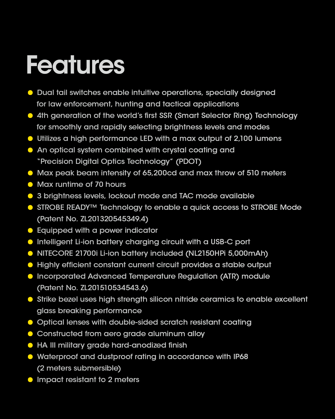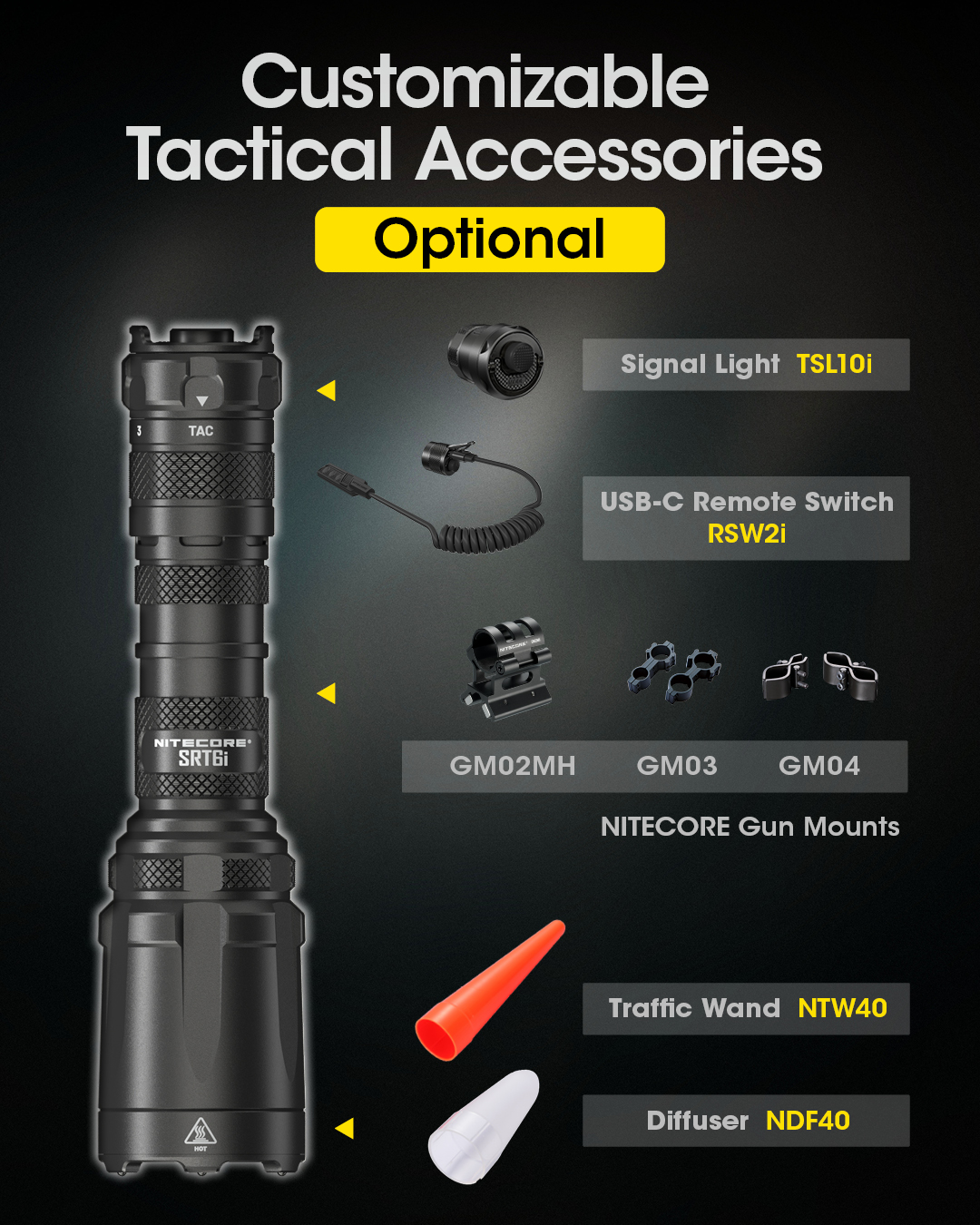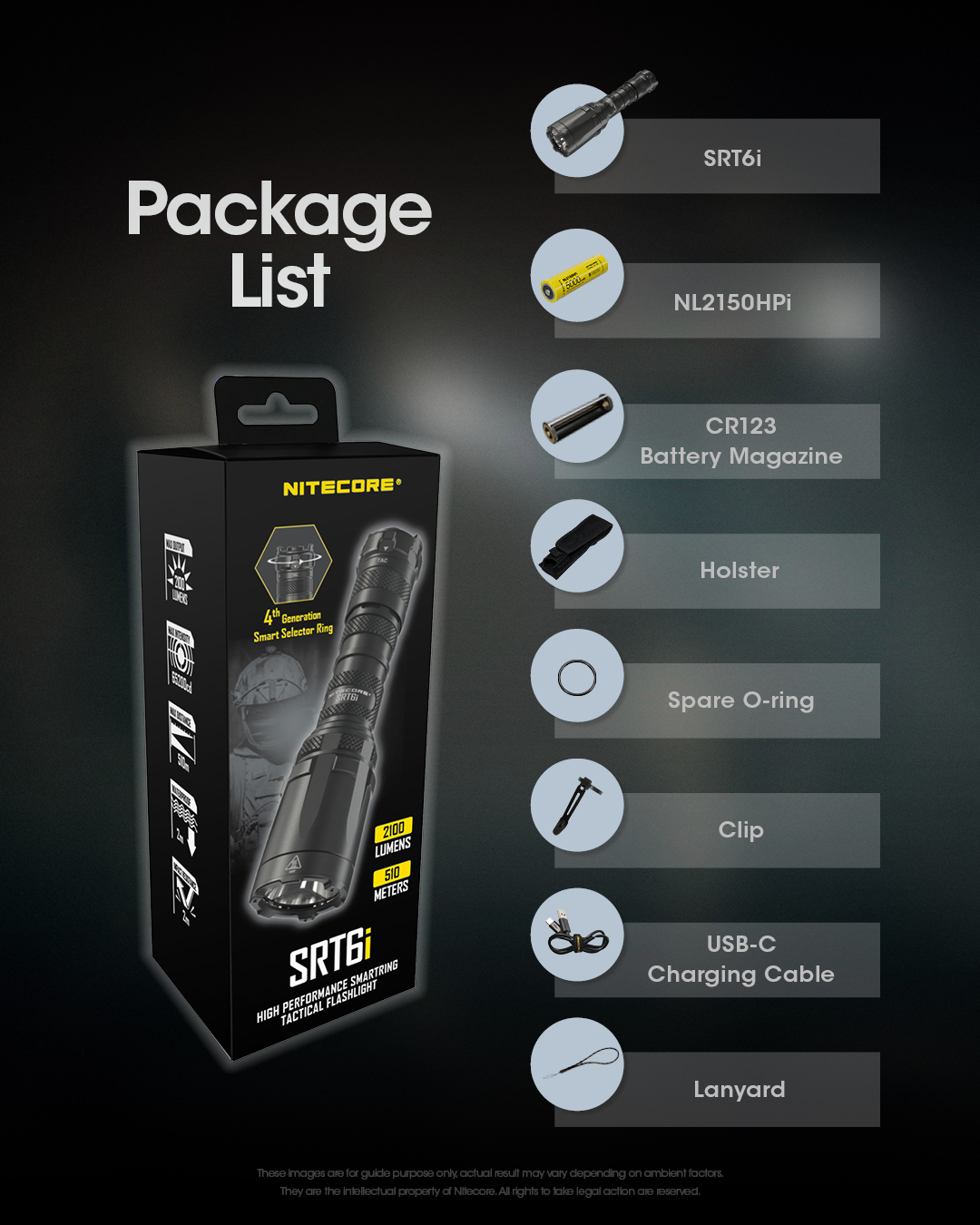 Package List : SRT6i flashlight *1,NL2150HPi battery *1,battery magazine *1,Holster *1,O-ring*1,Clip *1,USD-C Charging cable *1,Lanyard *1