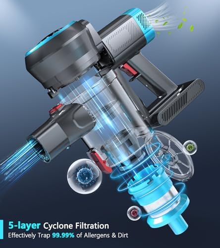 📟[Smart LED Display & 5-Stage High-Efficiency Filtration]➠Keep an eye on your cleaning progress with the smart display, which shows battery power, dust cup fullness, brush clogs, and suction modes in real-time. Our vacuum cleaners adopt a five-cone dust and air separation device, effectively capturing 99.9% of small dust particles and releasing purified air.