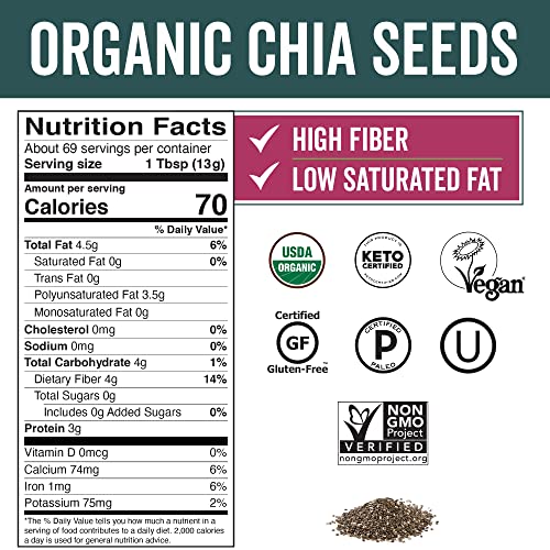 ✔️ Nutrient-Dense Superfood — These delicious superseeds are a great way to add a boost of vegan-friendly nutrients to salads, puddings and juices. Chia seeds organic whole foods contain dietary fiber, plus they’re low in saturated fat.