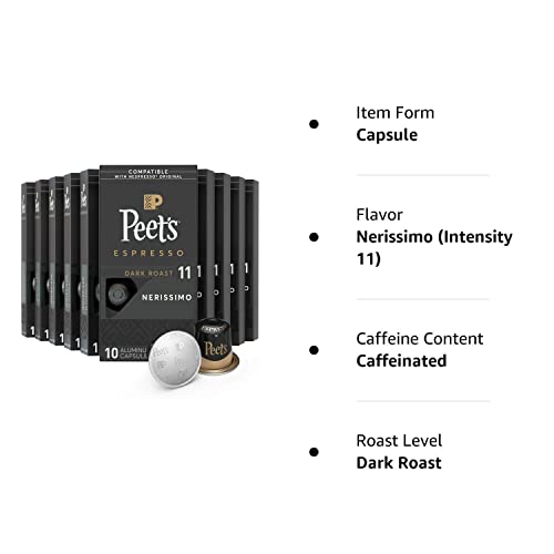 Peet’s Coffee Nerissimo Espresso Capsules; Peet’s Espresso is available in a convenient aluminum capsule that fits your Nespresso Original machine. Made with 100percent Arabica coffee, each capsule delivers the rich, high-quality coffee experience that you expect from Peet’s. Nerissimo (intensity 11, dark roast) is black as night and sweet as a brûlée topping. It is espresso’s deliciously biting answer to those who say you can’t have dessert all day. With milk or cream, bellissimo.