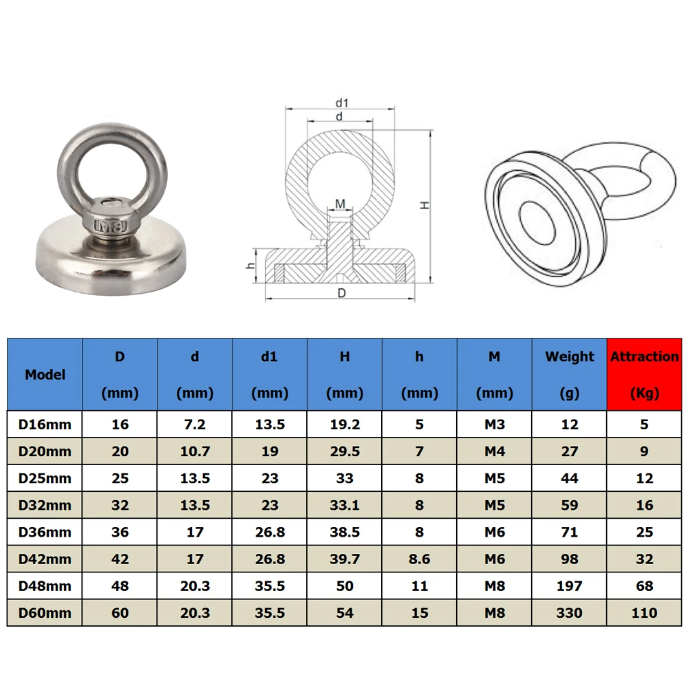 [Super Strong]- There are 8 different sizes and sizes. The diameter of this fishing magnet is 16/20/25/32/36/42/48/60mm, and the base uses a powerful neodymium magnet. Under ideal conditions, it can provide a pulling force of 5 /9 /12 /16 /25 /32 /68 /110 kg.