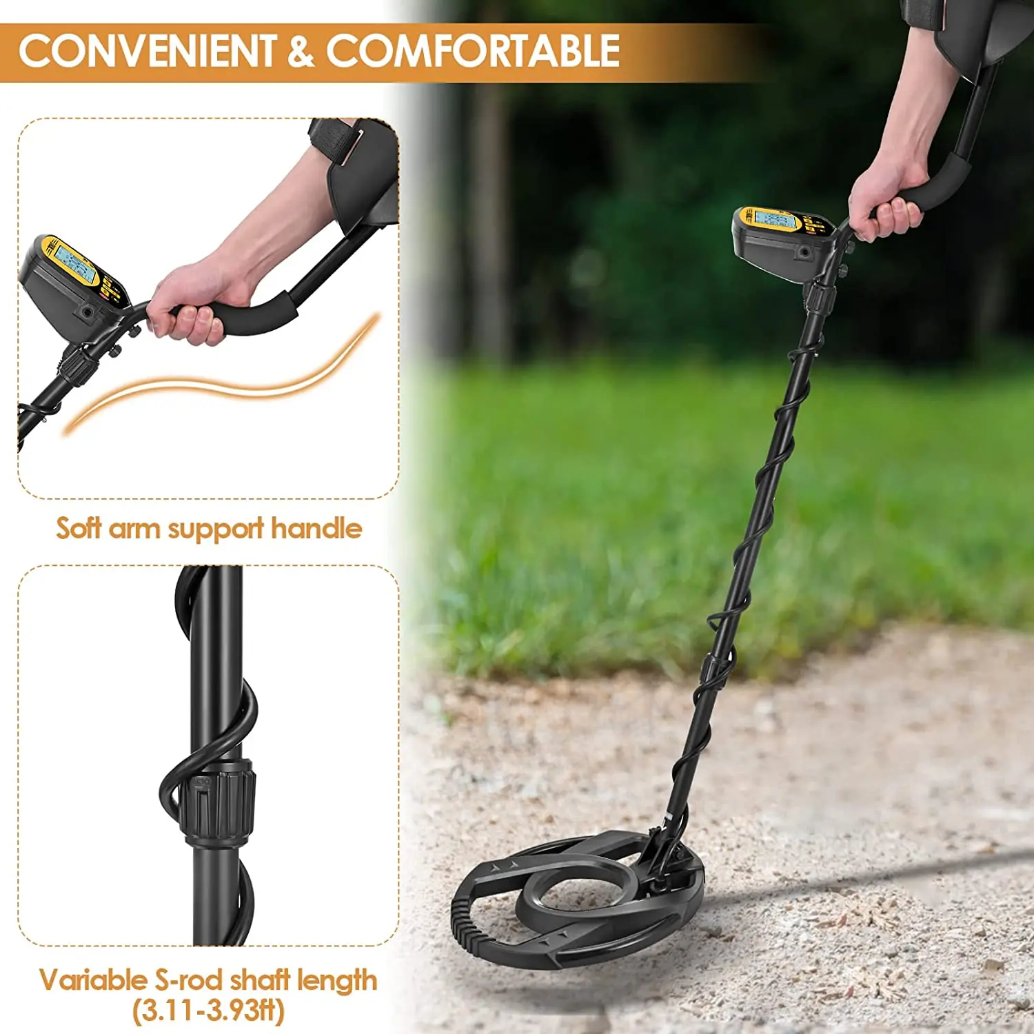 【Easy to Use & Comfortable Design 】The professional metal detector is light in weight, weighing only 3.5 pounds. The length of the rod can be adjusted from 30 inches to 41 inches. The handle covers the back of the hand. It's easy to use for a long time. This metal detector equipped with 3 different tones (low-middle-high), can help user to find which kind of metals to be detected. You can choose to focus in different environments and enjoy it.
