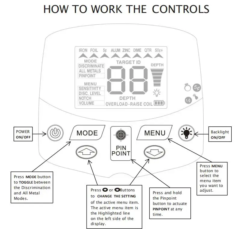 3 Detection Mode: All Metal (Detect all kinds of metal), Disc (Discriminate metal type), Pinpoint(Find the exact location of a target)