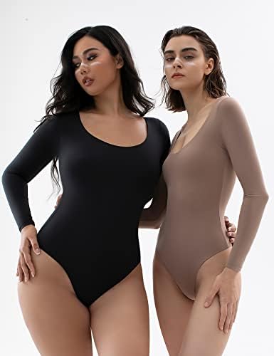 PUMIEY Women’s Scoop Neck Long Sleeve Bodysuit Body-hugging Sexy Tops Smoke Clo …