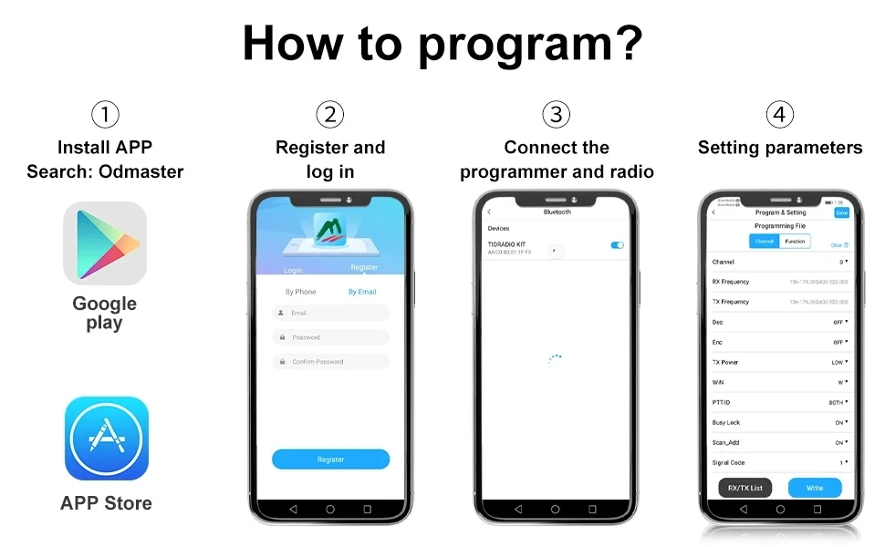 ✔ 【APP works with your mobile phone to quickly program】 anytime and anywhere quickly connect to the nearest repeater, customise the buttons of the radios, share the frequency scheme between the same models, and more function. More convenient and smarter than Chirp, you can use Web Odmaster batch prog on PC.