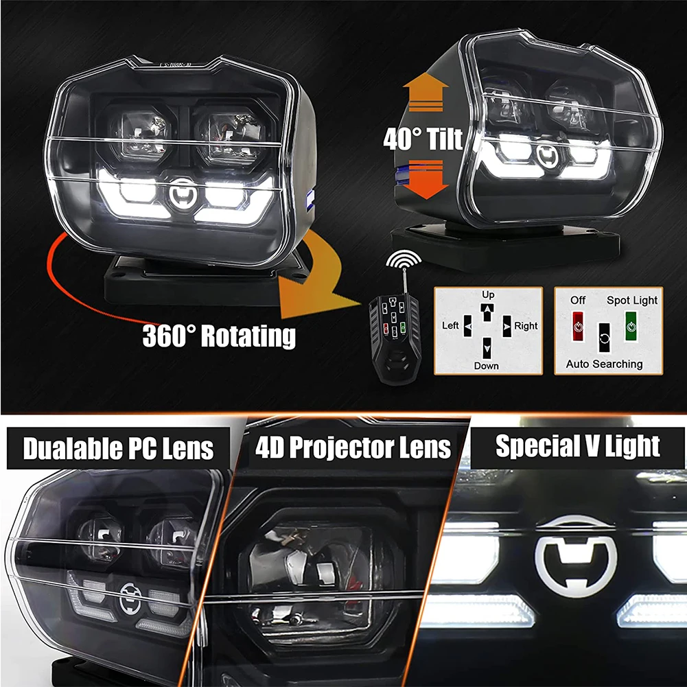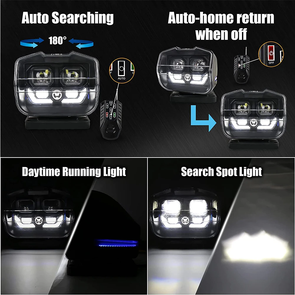 The Newest Design:The spot light with a unique and fantastic V Logo in the middle.There is a unique blue light bar on the back to make the search light look more modern and wonderful.Automatic search function, the search light automatically rotates and scans left and right, the automatic scanning angle of the light is about 180 °. Auto-home return when off function, no matter where the light is turned, as long as you press OFF, it will return to the origin position(front side).