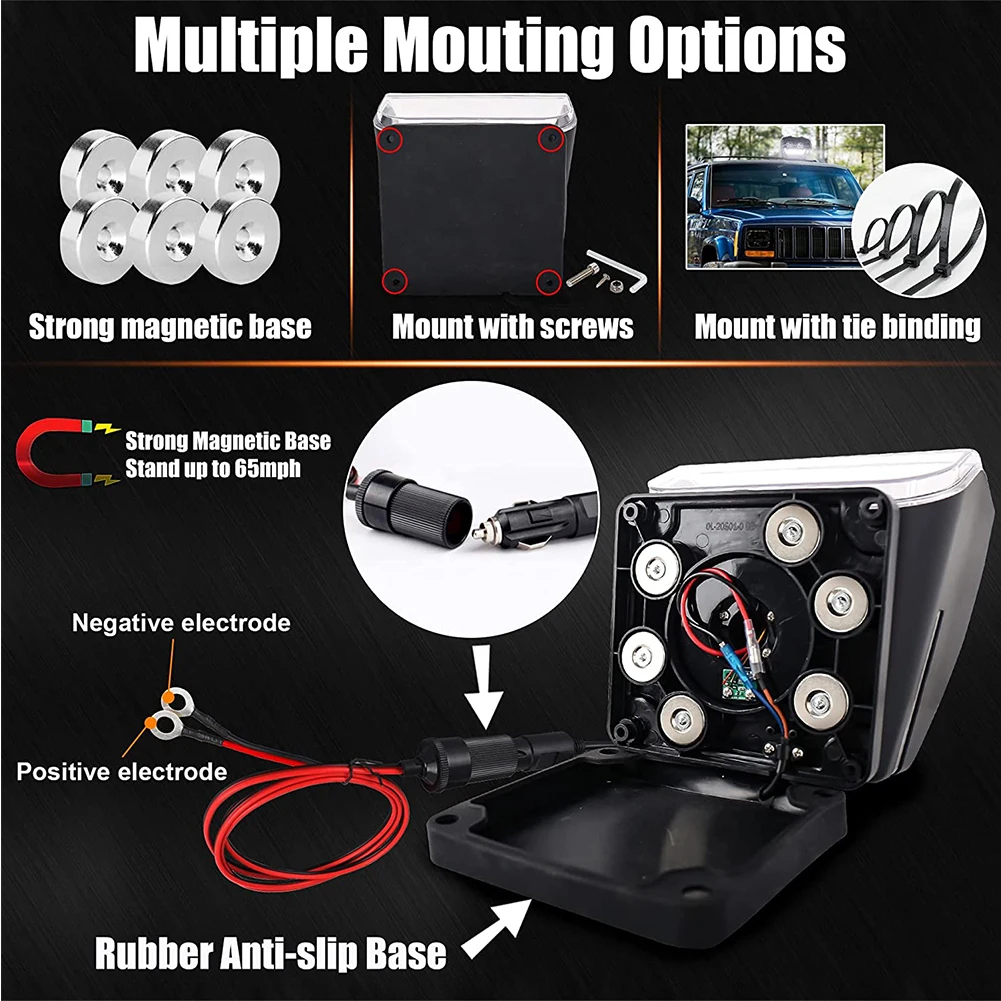 3 Ways to Install:This Led Search Light with strong magnetic adsorption(6 magnets at the bottom of the search light), which can be stick on your car. If some vehicles do not have much iron metal content or the surface is uneven, other installation methods can be adopted. Screw installation, allowing you to gallop in the wind and enjoy the joy of speed. Also it could ties binding installation.