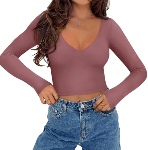 REORIA Womens Sexy Casual V Neck Long Sleeve Double Lined Fitted Going Out T Shirts C …