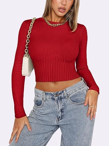 REORIA Women’s Trendy Fall Crew Neck Cropped Sweater Long Sleeve Ribbed Knit Pu …