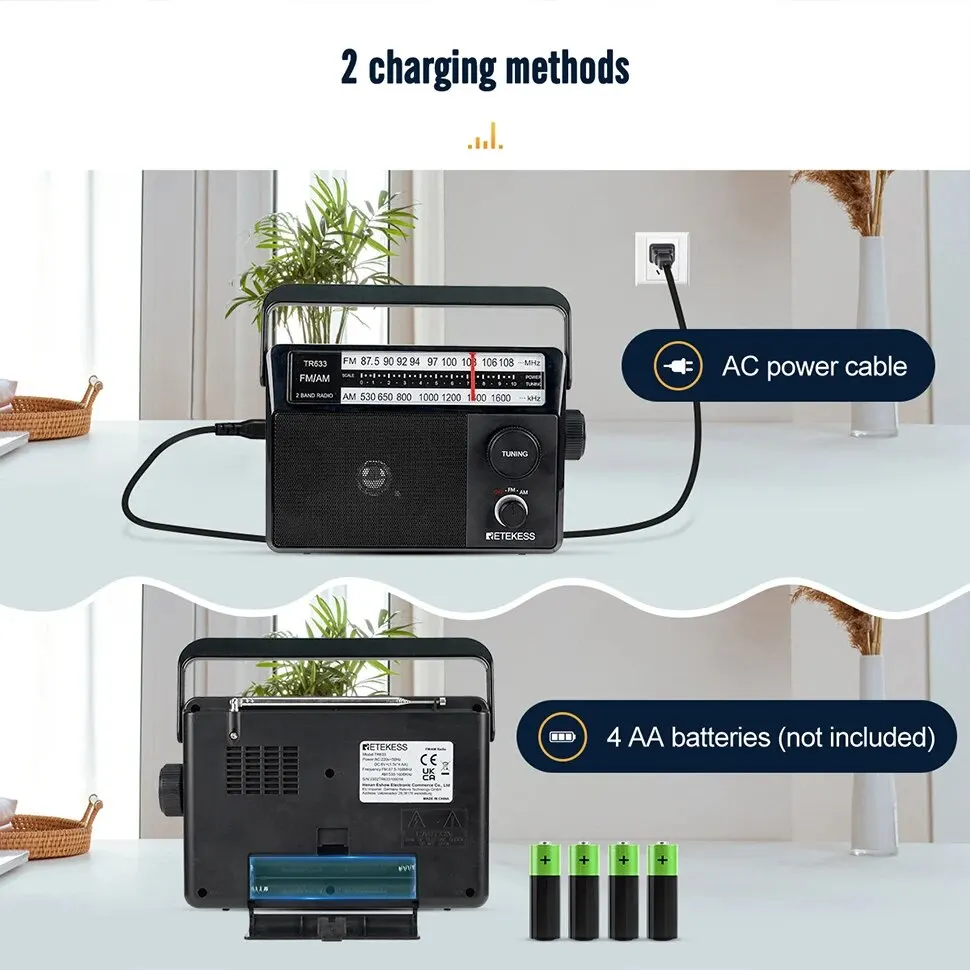 2 charging methods:Prepare 4 AA batteries(not include) for this AM FM radio; AC power for you to plug the charging cable(include) in the wall to listen radio whole day.