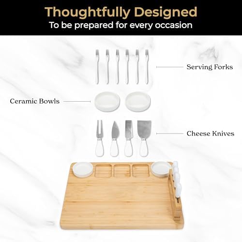 🎁 DESIGNED TO MEET YOUR DIVERSE NEEDS – Throw an epic party or host an intimate gathering made possible with all the enhancing features of our charcuterie boards. A removable magnetic holder keeps 4 serving knives and utensils upright and easily accessible. Two ceramic serving bowls for sauces and dips and six sampler forks compliment your decadent charcuterie tray. Our bamboo cheese board and knife set offer everything you need to build a stunning presentation for family and friends.
