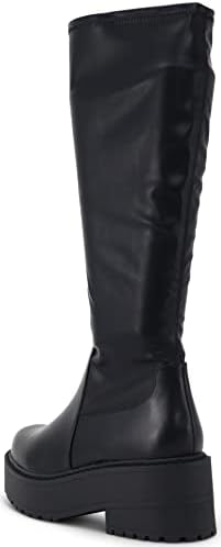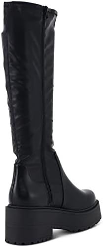 This knee-high boots features a rounded toe, faux leather material, lug sole platform, elastic shaft for a comfortable snug fit, side zipper for effortless and easy to put on and off.