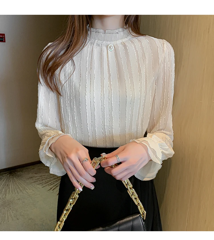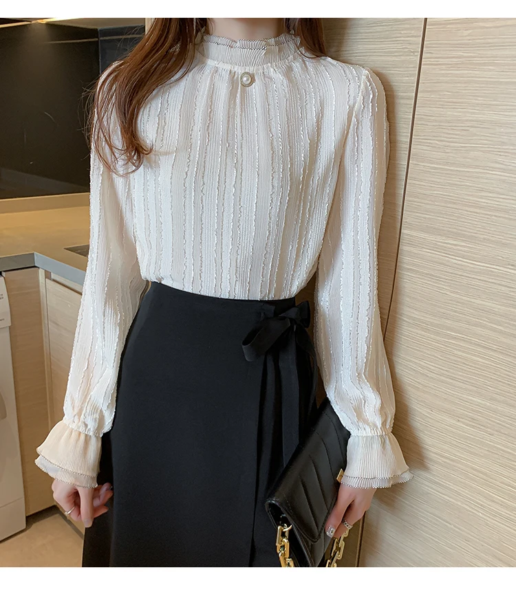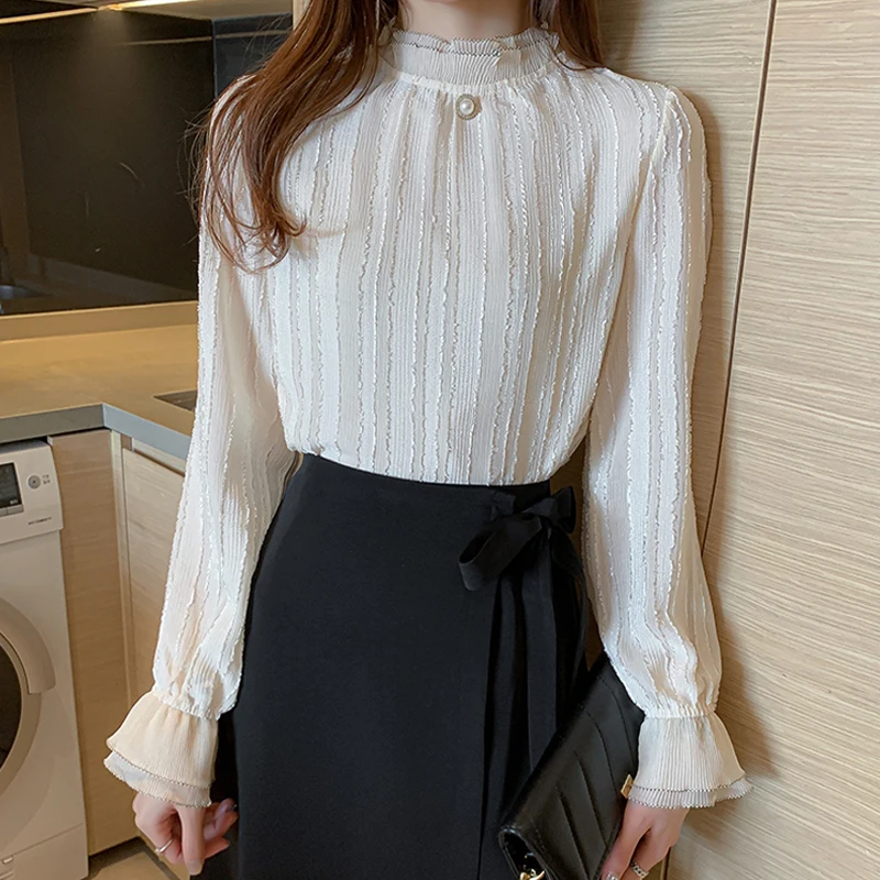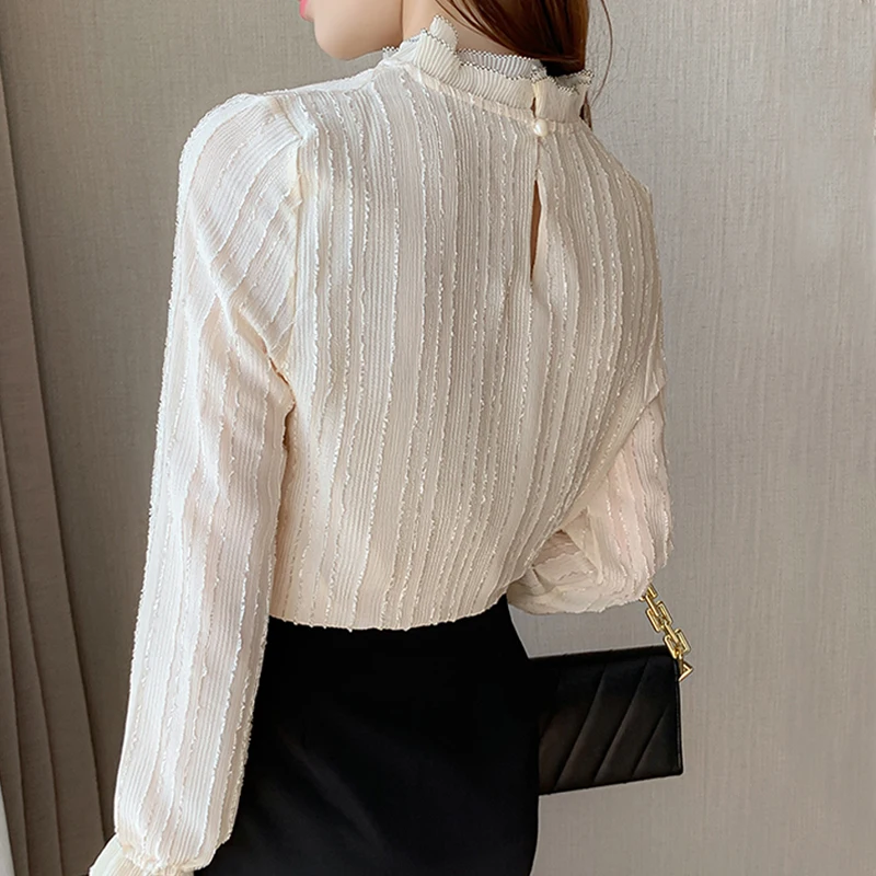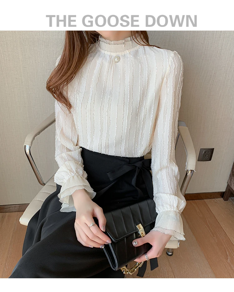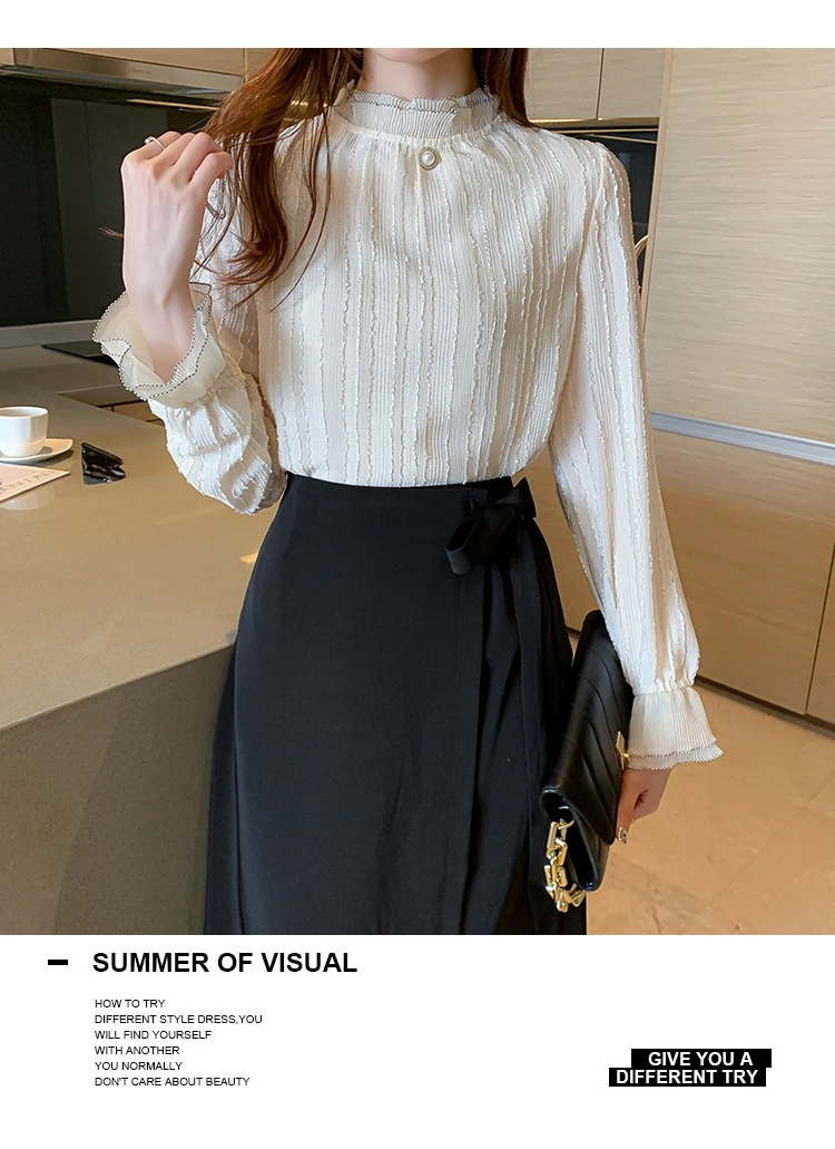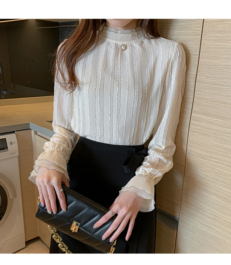 Spring Long Sleeve Top Lace Chiffon Women Blouses Ruffle Shirt Ladies Pleated Blouse …