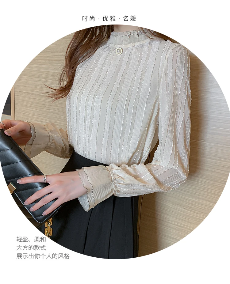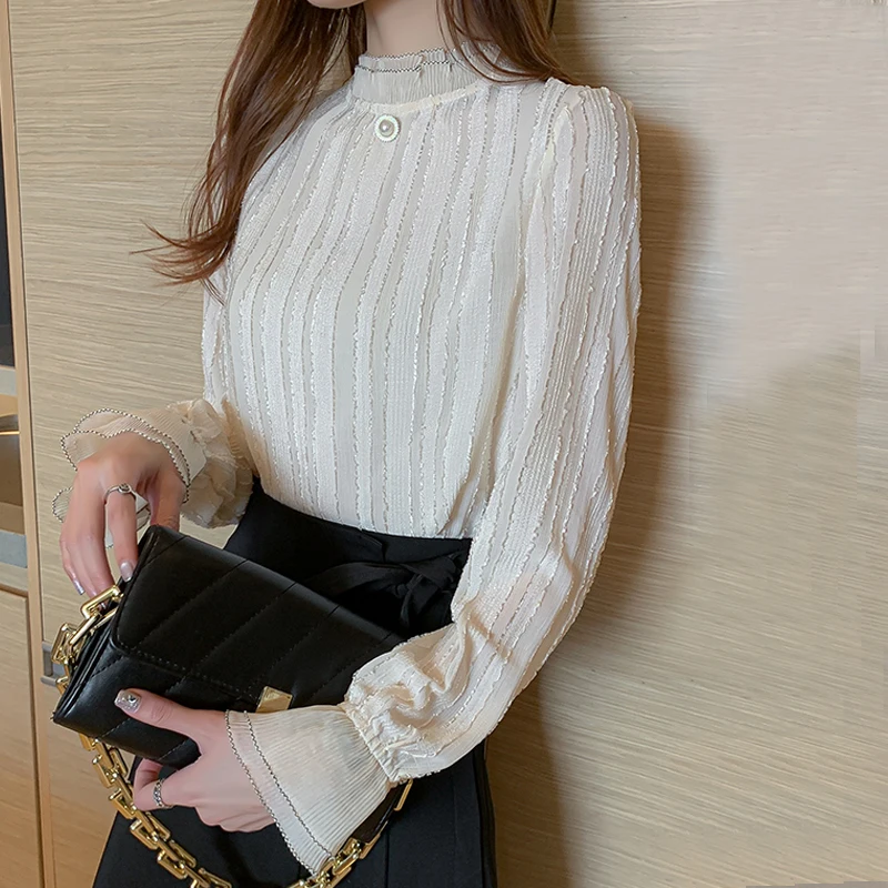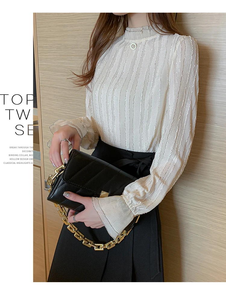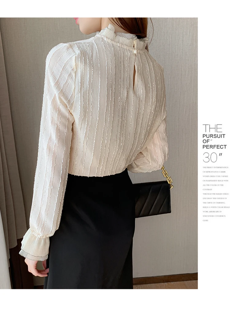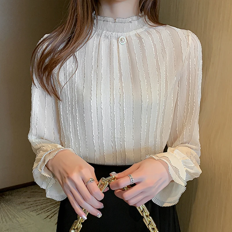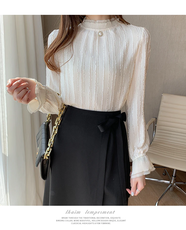 Spring Long Sleeve Top Lace Chiffon Women Blouses Ruffle Shirt Ladies Pleated Blouse …