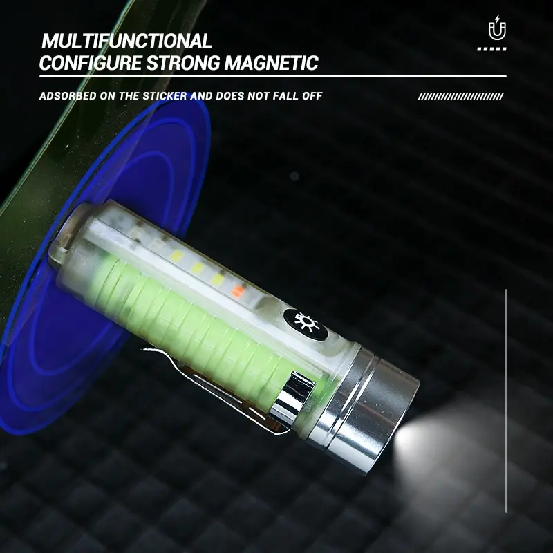 8 Lighting modes: (main light high brightness) – (main light low brightness) – (main light strobe) – (side white lights + main lights are on together) – (side lights flashing red and blue + main lights on) – (side white lights on) – (uv violet light) – (red and blue flash).