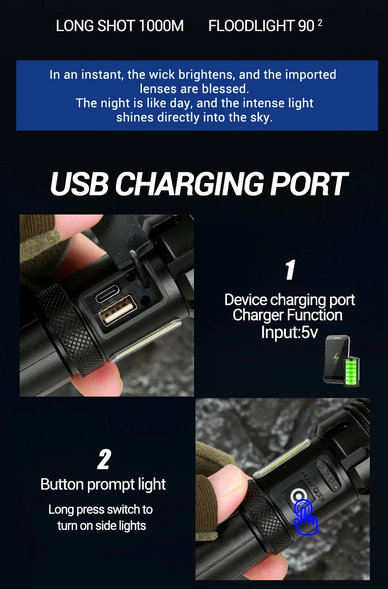 • Super Bright LED Flashlight :With a brightness of 1000 lumens, this flashlight is perfect for outdoor activities like camping and hiking.