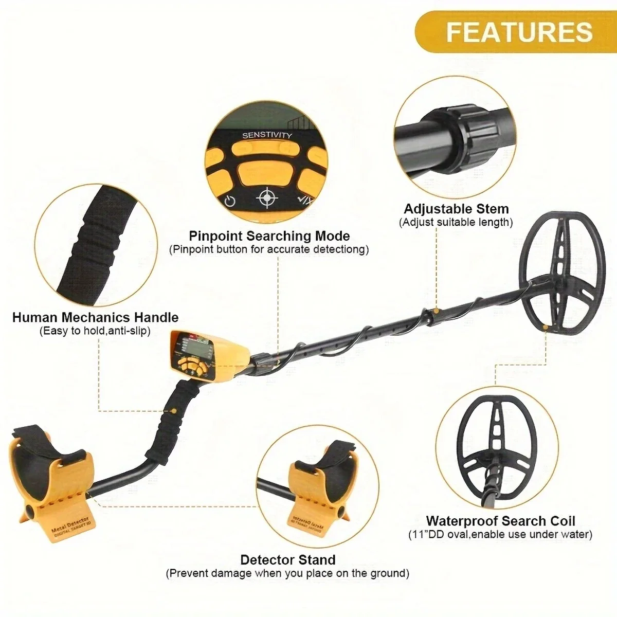 1. Apply electromagnetic fields to detect the presence of hidden metal objects.2. Designed for finding underground gold and silver jewelry, coins and other metals and mines.3. The height of the metal detector is adjustable, with ground balance and exploration mode recognition.4. Light and sound indicate that metal is detected.5. 4 AA batteries (batteries not included).6. The sensitivity of the size detection range is adjustable.7. Earphone sound mode, suitable for private search in noisy environment or crowded places.8. Low battery indicator, indicator light9. Digital display plus backlight function