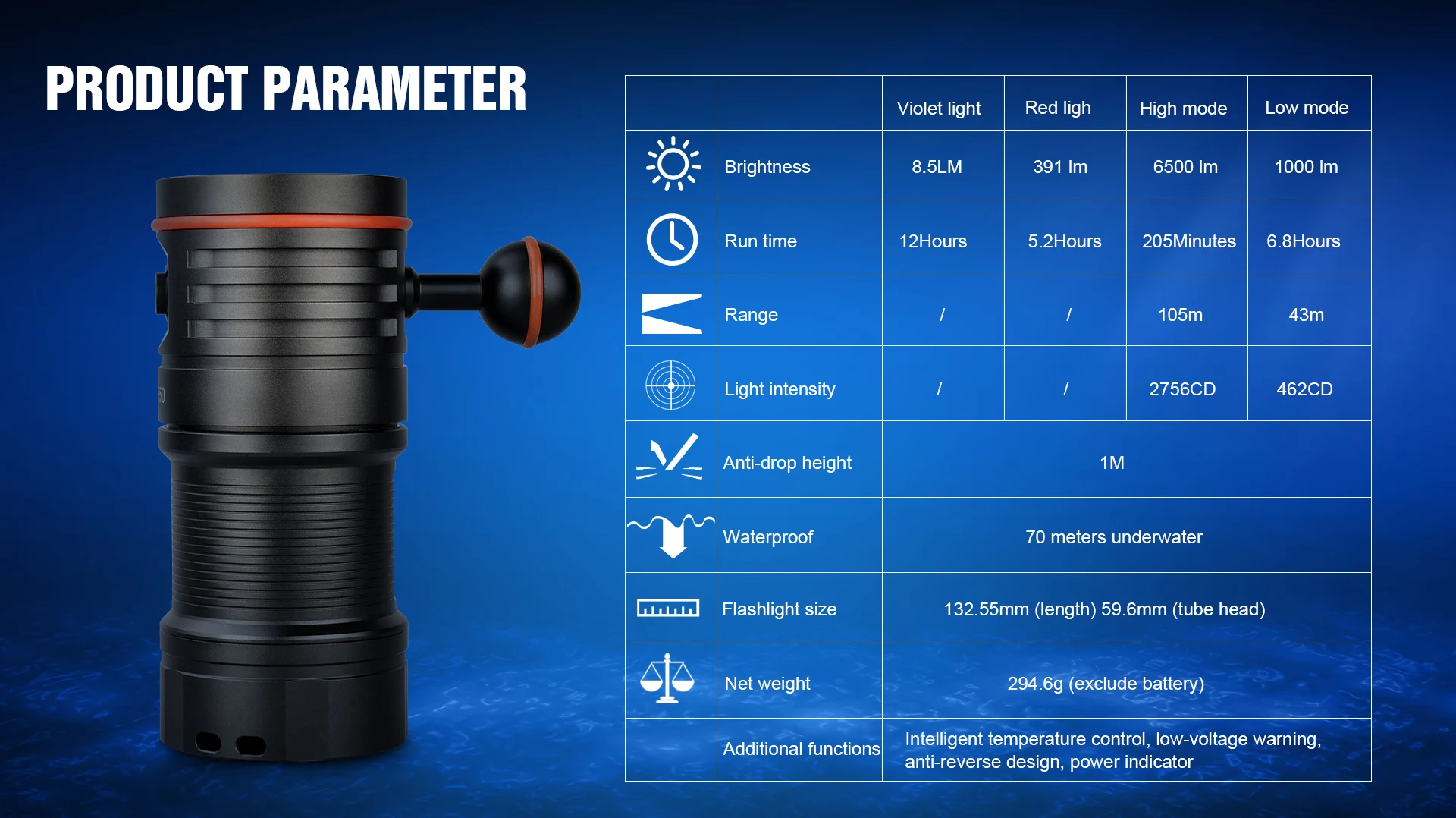 150 degrees wide beam angle, suitable for underwater photography and video lighting. White/Red/UV LED creating a great light for viewing all types of sea lifeGreat coverage! No blind angle for underwater photography.