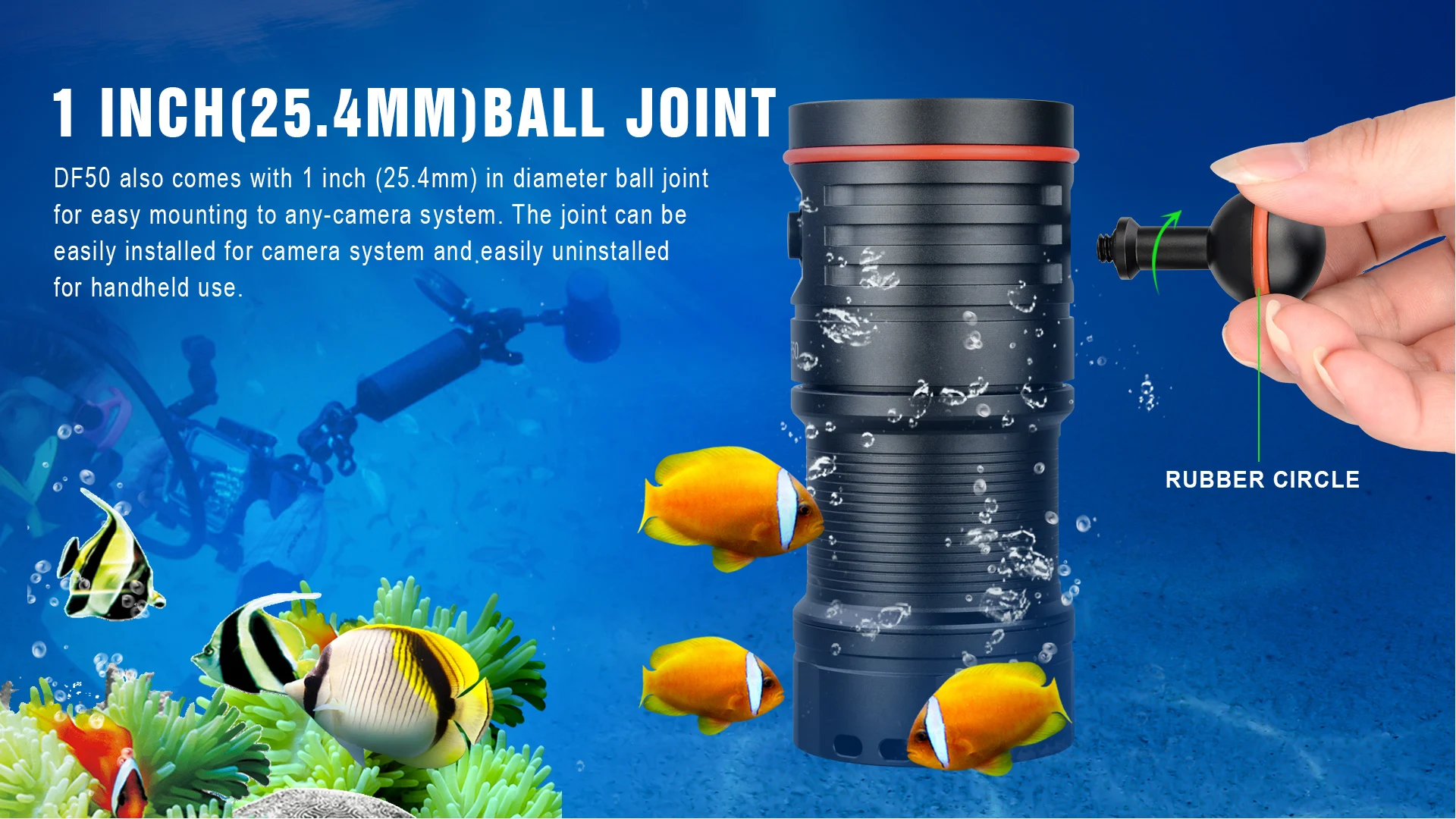 the dive light Comes with a ball joint for easy mounting to any-camera system such as Xiaoyi, Gopro, action cameras and DSLR camera.