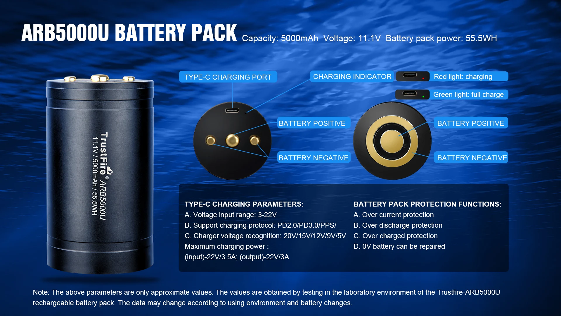 Type-C charging parameters: A. Voltage input range: 3-22V B. Support charging protocol: PD2.0/PD3.0/PPS/