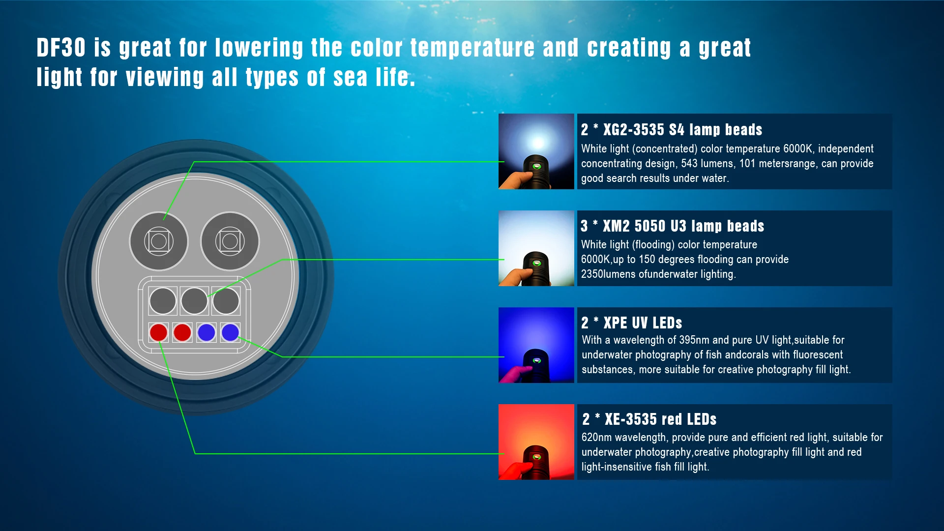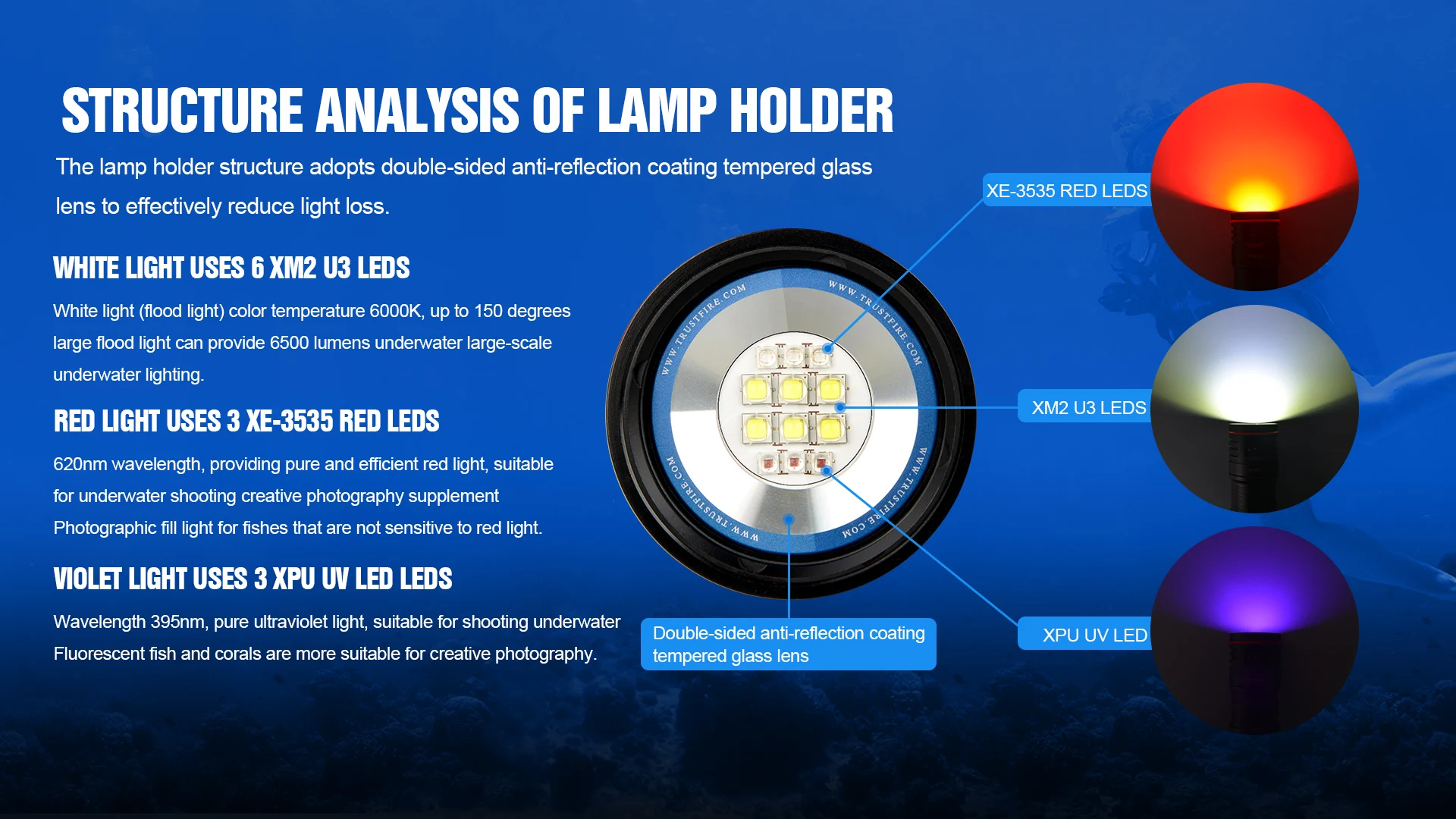 Violet light uses 3 XPU UV LED leds:Wavelength 395nm, pure ultraviolet light, suitable for shooting underwater Fluorescent fish and corals are more suitable for creative photography