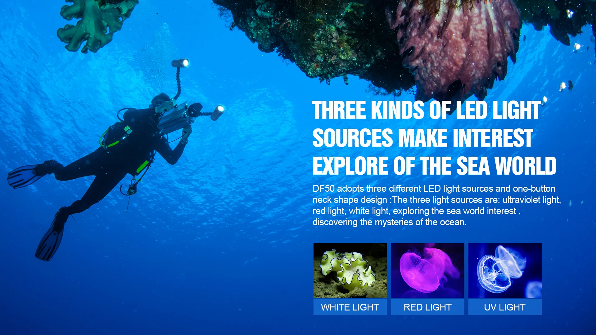 DF50 adopts three different LED light sources and one-button neck shape design; the three light sources are: ultraviolet light, red light, and white light, which can meet different needs.