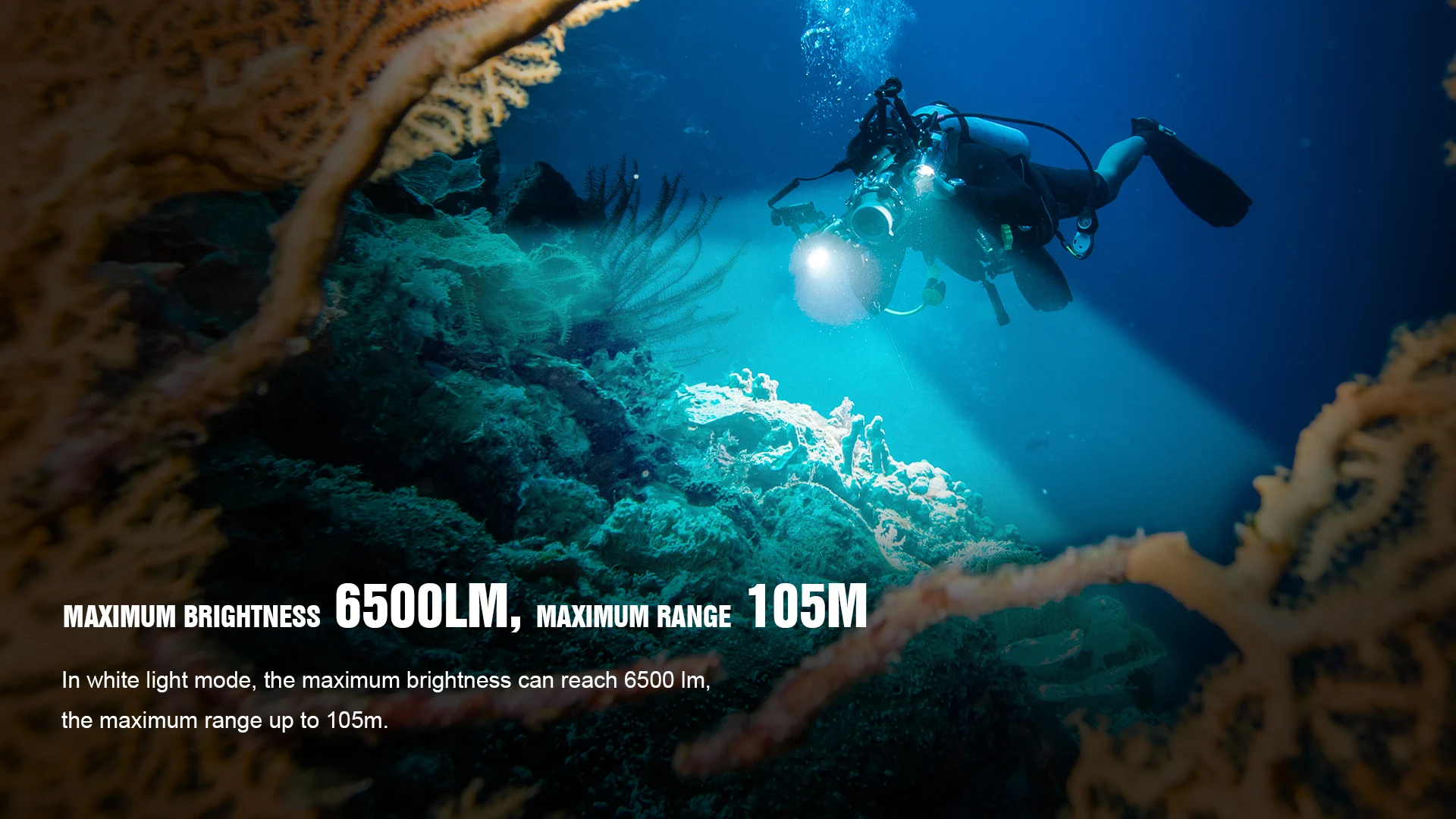 In white light mode,the Max brightness up to 6500 Lumens,and Max beam range 105 Meters