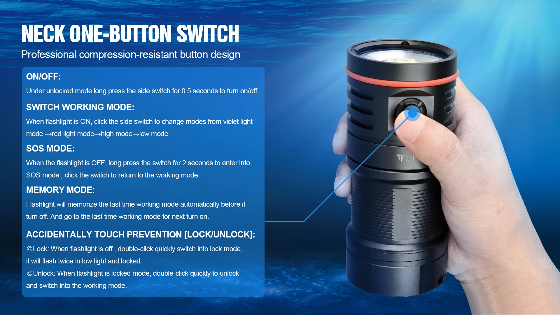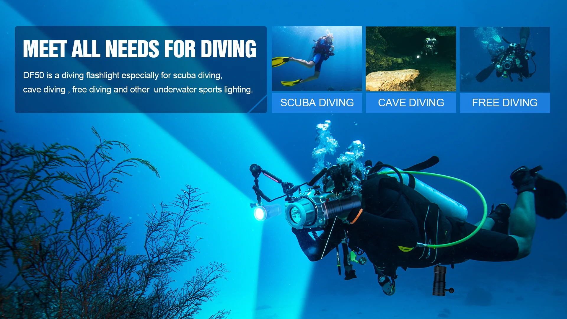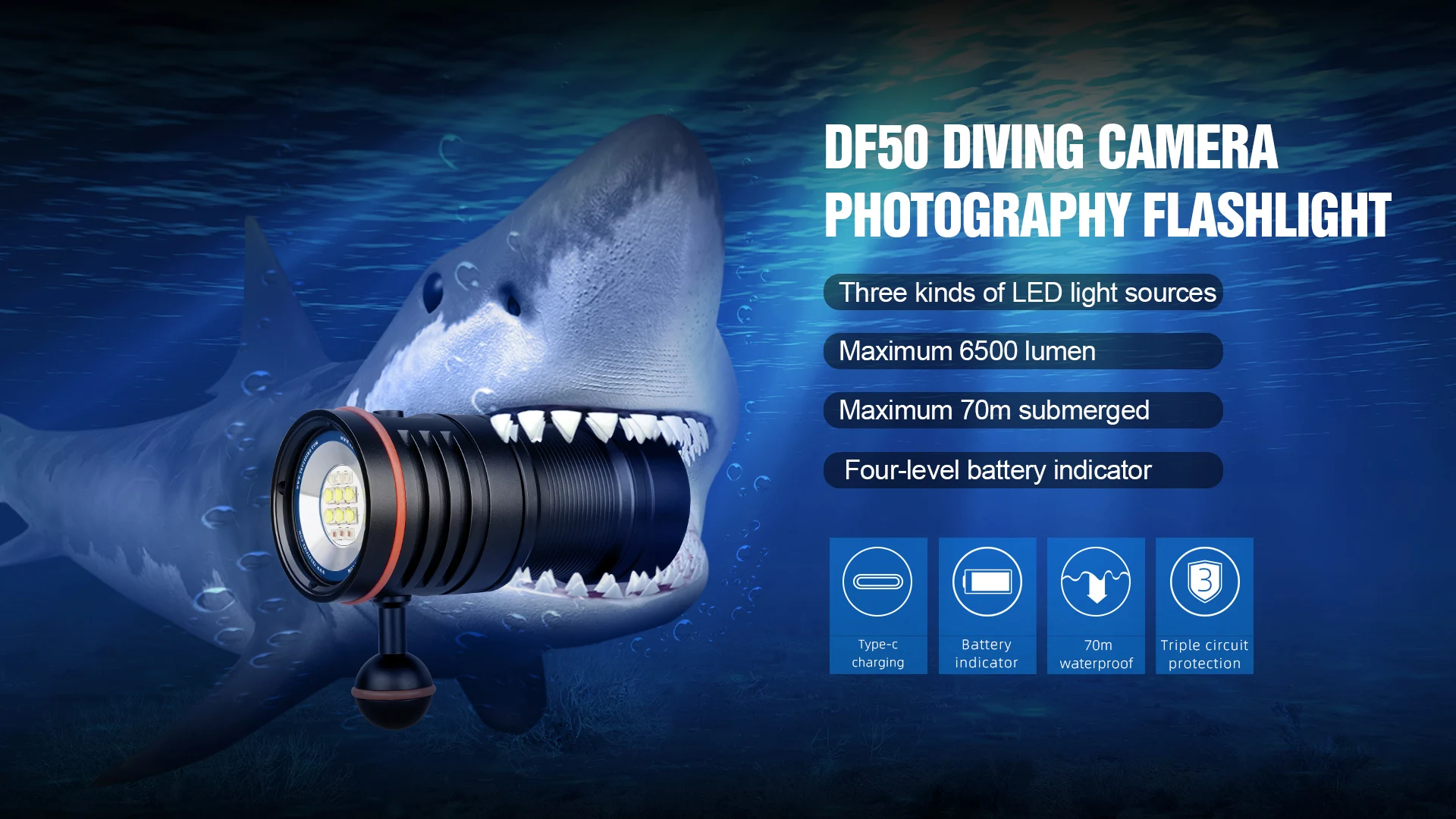 TrustFire DF50 is a diving flashlight specially designed for scuba diving, cave diving, free diving and other underwater sports lighting.