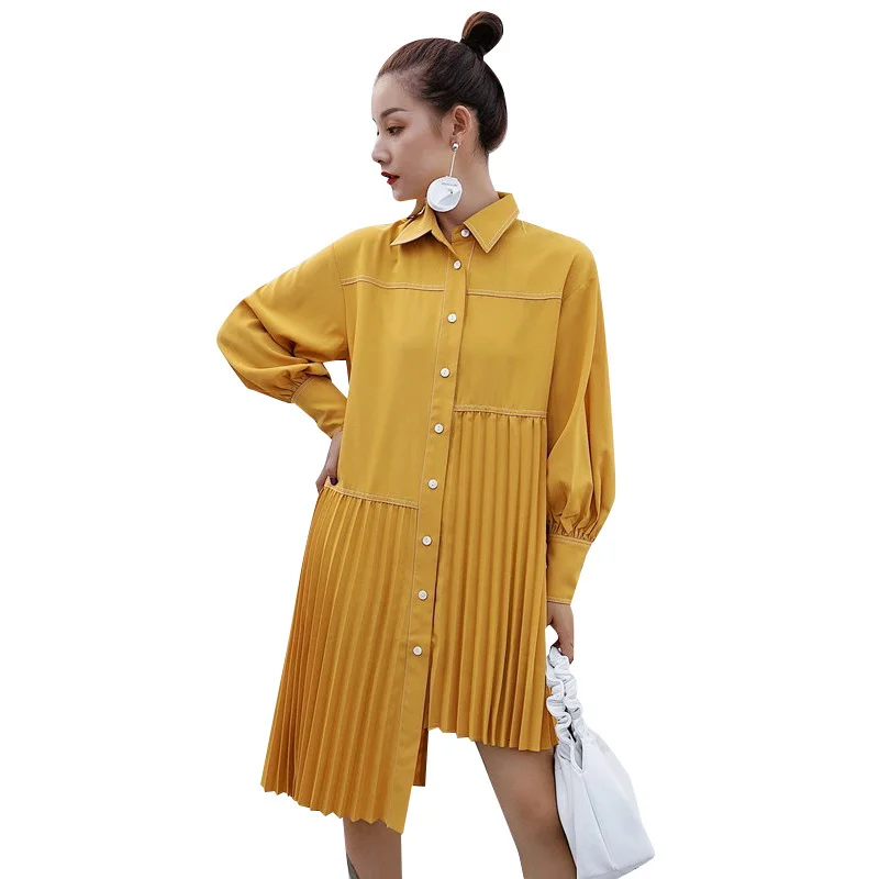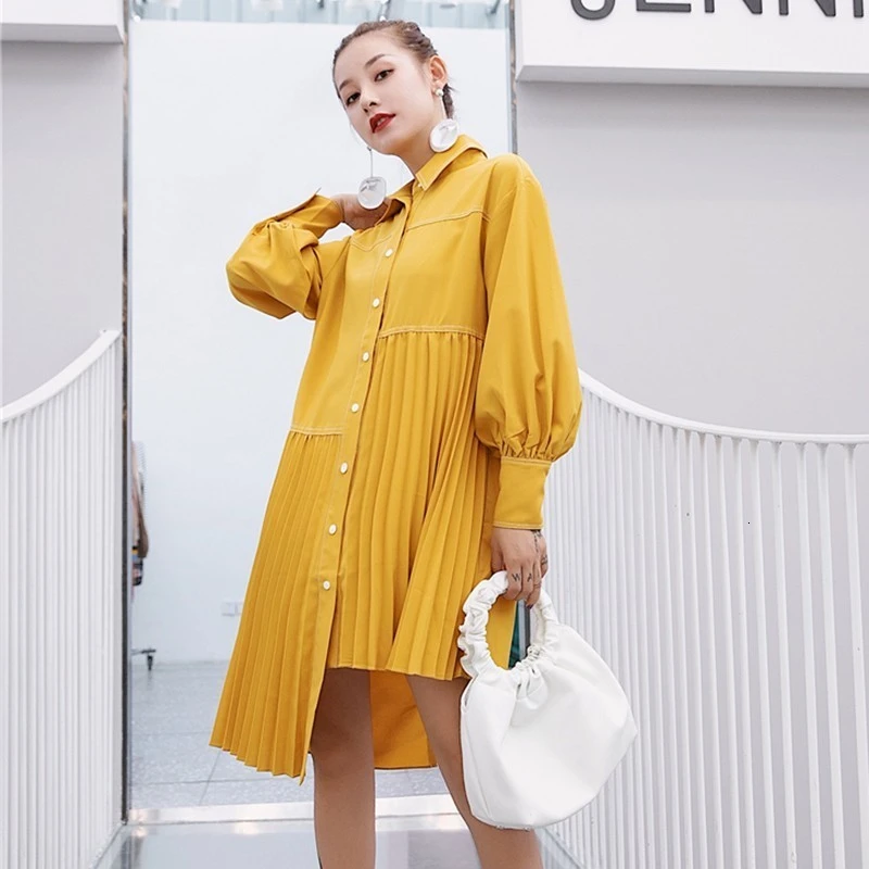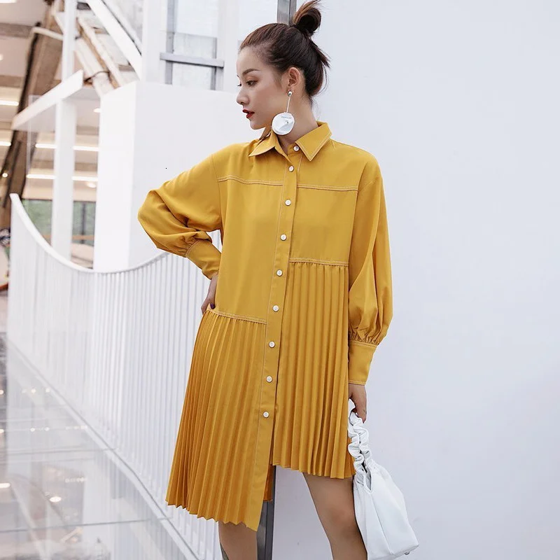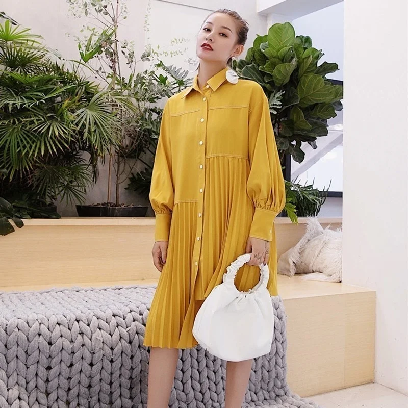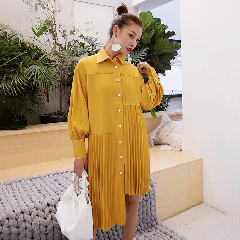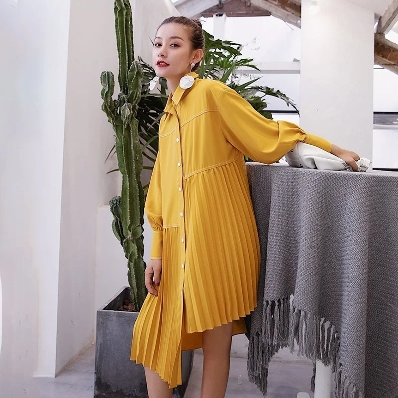 TWOTWINSTYLE Casual Pleated Women's Dress Lapel Collar Lantern Long Sleeve Asymme …