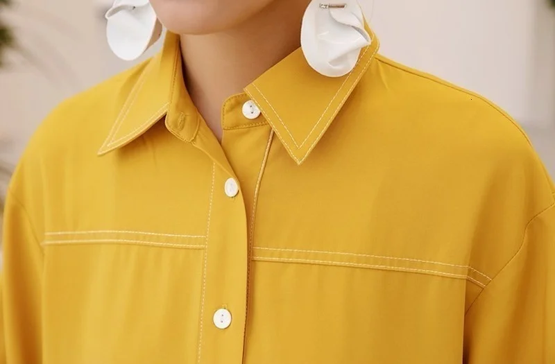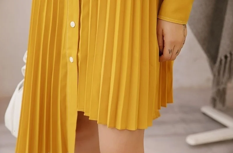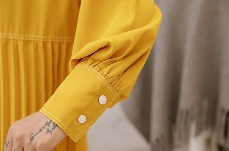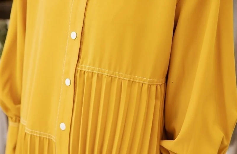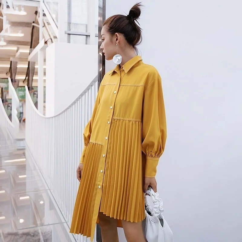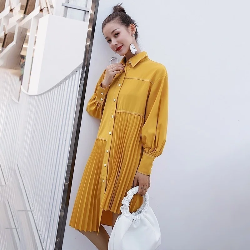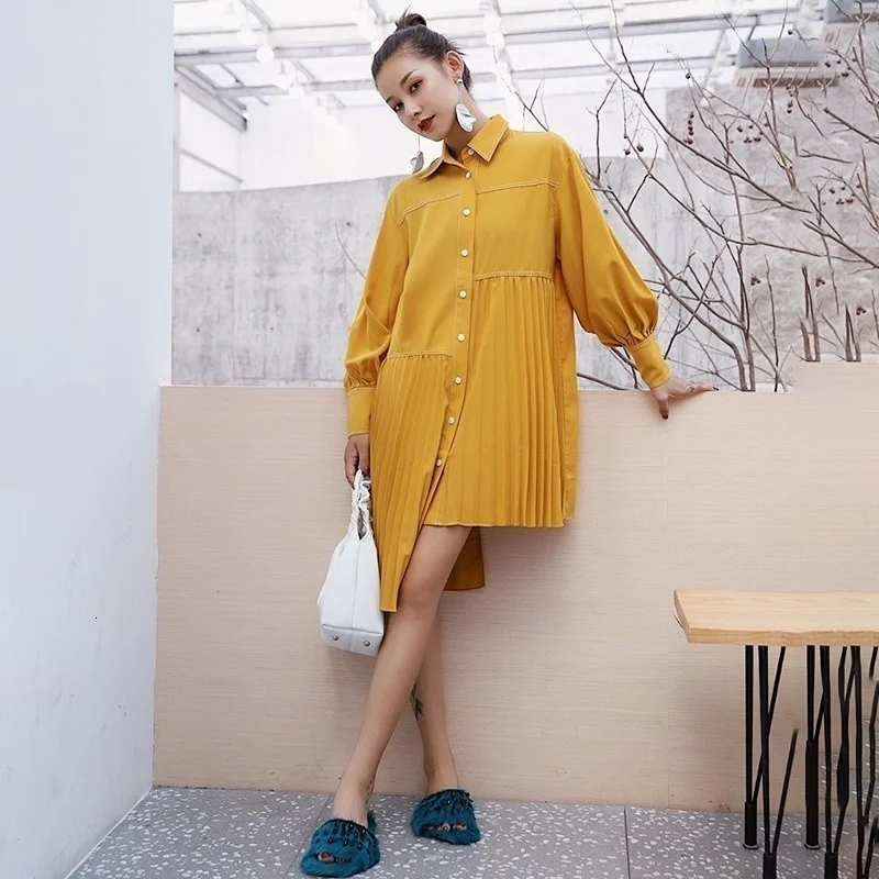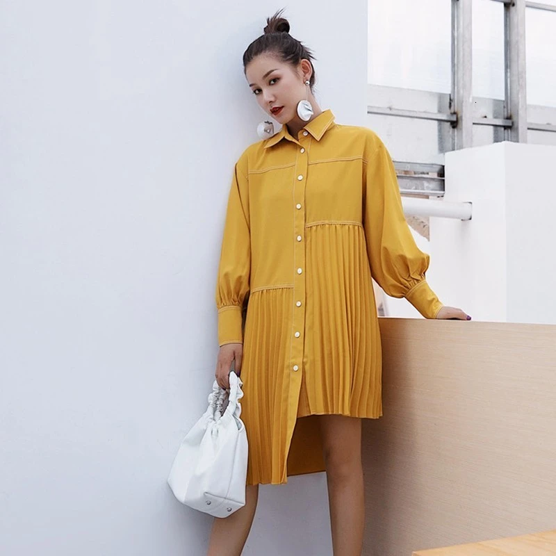 TWOTWINSTYLE Casual Pleated Women's Dress Lapel Collar Lantern Long Sleeve Asymme …