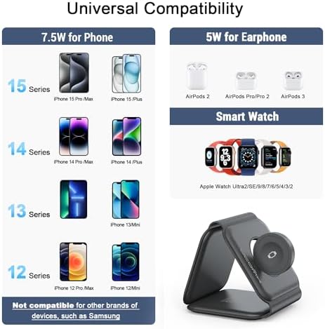 Note: 1. The wireless iPhone charger can accurately identify foreign objects and flash the indicator light. 2. This iPhone and watch charging station is compatible for all iPhone 12-15 series , and the magnetic attraction function is only for iPhone 12-15 and more advanced. If you have any questions, please feel free to contact us, providing you with the best service is our pursuit.