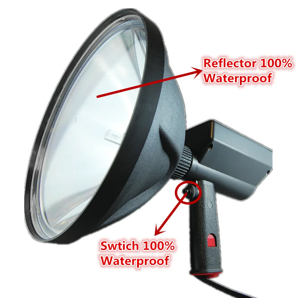 Description The HH10"-HID-75W/100W/150W/220W/300W is an extremely rugged and powerful spotlight designed to provide maximum output and high reliability.This spotlight produces a 8000 lumen light beam capable of reaching over 2000meters in length and can be user adjusted to produce either a tightly focused and intense spotlight beam or a wide floodlight beam. This light operates on 12 or 24 volts DC and includes a 4meters straight cord with cigarette plug for connection to vehicles, boats ATV's and similar vehicles. Specification Lens Size:240MM Material: Heavy Duty Nylon Construction Voltage:12V Lightsource:HID Bulb Power: 75W/100W/150W/220W/300W Brightness:6000LM/8000LM/9000LM/10000LM Beam Distance:2000M ( Max ) Beam Type:Flood and Spot Adjustment Features * Lightweight Ergonomic Design * Heavy duty nylon and polycarbonate construction * Reflectorhousing rotates to easily tailor beam pattern to suit operator's requirements, flood or spot * Polycarbonatelensand aluminium reflector for high temperature resistance * Quality On/Off switch for operator comfort and durability * 5/16 BSW durable brass ferrule for mounting options * Ergonomically balanced handle for superior handling with user friendly texture to ensure 'no-slip' in adverse conditions * High specification bulbs to ensure unequalled brightness * Lanyard securing point for extra security *4 metre straight cord endswith cigarette plugor alligator clip * HID is three times brighter than halogen's Warranty 3 Years against manufacturing defects Package Included 1*100/150W HID Spotlight 1*12V Female Plug With Alligator Clip