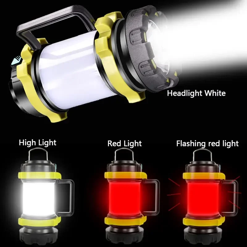 Multifunctional Lantern – The front light is a white light torch with full brightness (8000 lumen, 3 hours) and half brightness (4500 lumen, 6 hours). The side light is a lantern with white and red light. The white light mode has full brightness (2000 lumen, 2.5 hours) and half brightness (1000 lumen, 4.5 hours). The red light one has full brightness and flashing mode.