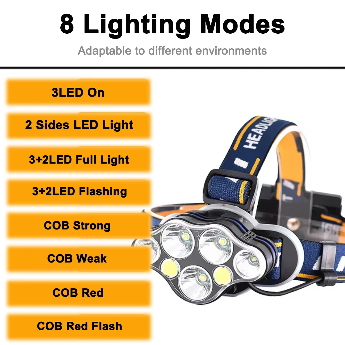 Mode: Middle 3LED bright – Both sides LED bright – 3LED+2LED bright – 3LED+2LED flash – COB white light strong – COB white light weak – C0B red light – COB red light flash