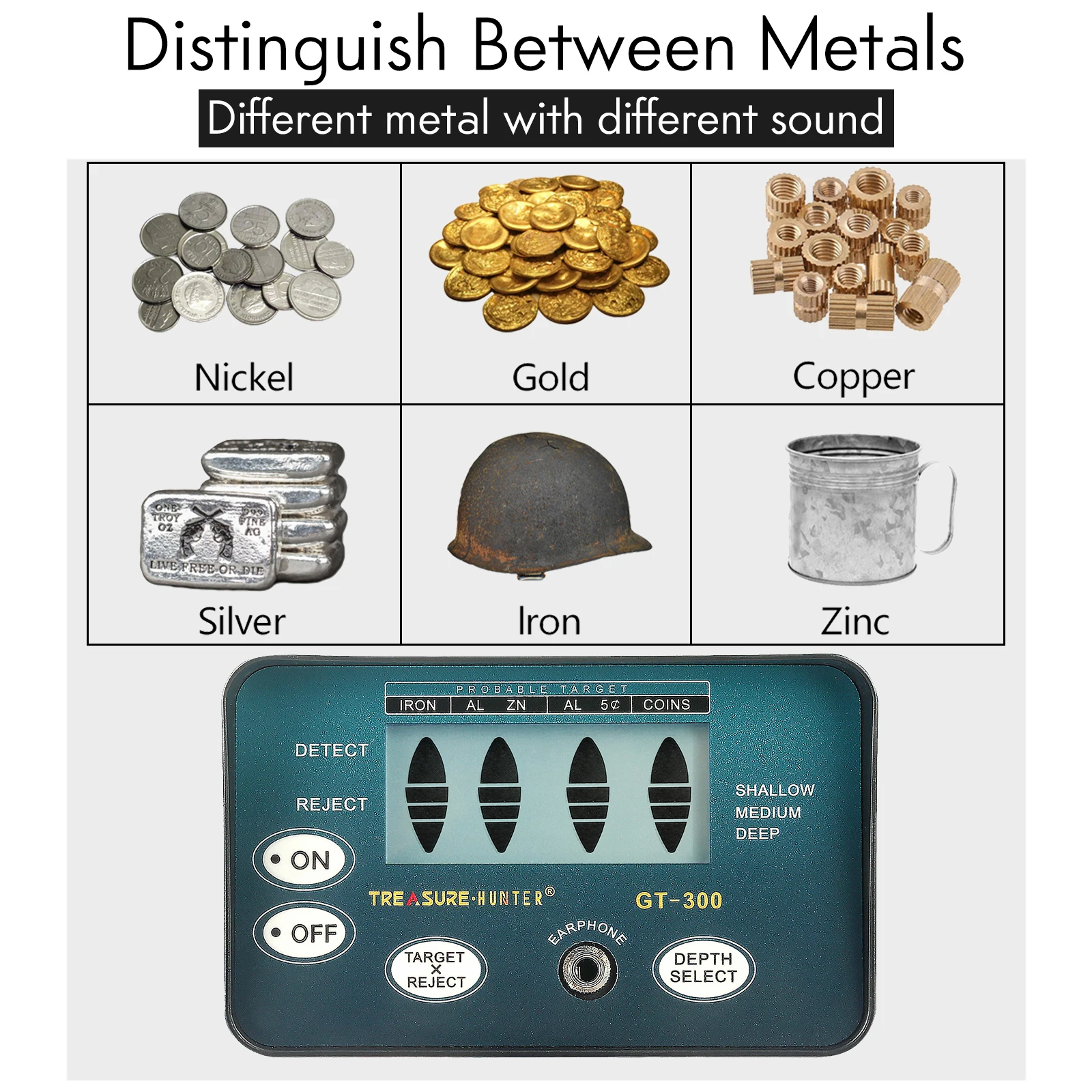 Detect Objects: Metal(Iron nail, iron covering, aluminum ring, small aluminum product, coins, gold, bronze, silver)