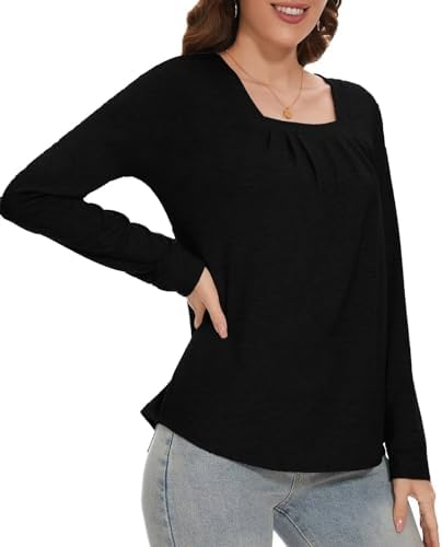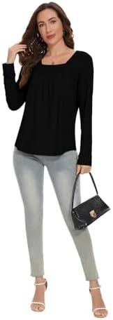 Women’s Casual Long Sleeve Tunic Top Pleated Square Neck Shirts for Leggings