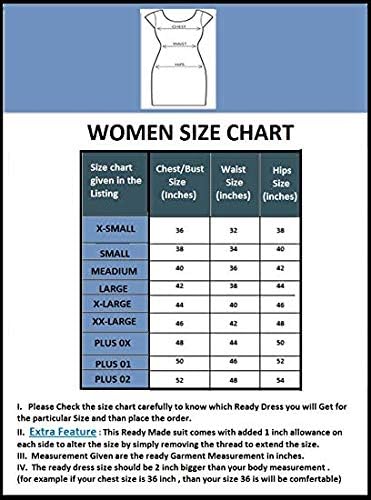 SIZE CHART GUIDE :- The measurements in above Size Chart are considered as body measurements. The ready garment size will be 1-2 inches bigger than body measurements mentioned in the chart. The Ready Garment Size at Bust for all the above sizes in inches will be as following, (XS-36); (S-38); (M-40);( L-42);(XL-44) (XXL-46); Plus Size ( 0X-48) (1X-50) Customize stitch unstitched
